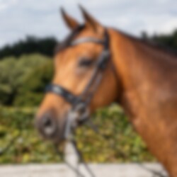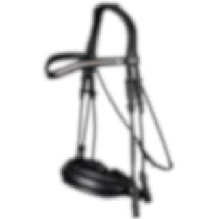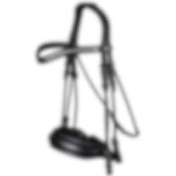 Diese schöne rundgenähte Kandare hat viele Funktionen. Der Nasenriemen ist ergonomisch und extra breit mit dünner werdenden, bogenförmigen Seiten für ein geringeres Risiko von Quetschverletzungen zwischen Gebiss und Nasenriemen und wird mit einem Pullback geschlossen.