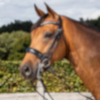 Das Genickstück der Kandare ist anatomisch gestaltet und bietet ausreichend Platz für die Ohren. Die Backenstücke werden an den Seiten festgemacht, um den Druck zu verringern. Das Genickstück dieser Kandare ist außerdem mit Neopren gepolstert und mit weichem Lammfell (ohne Fell) gefüttert. Die rundgenähten Kandaren der Dyón Dressage Collection werden mit Stirnbändern mit Strasssteinen geliefert.