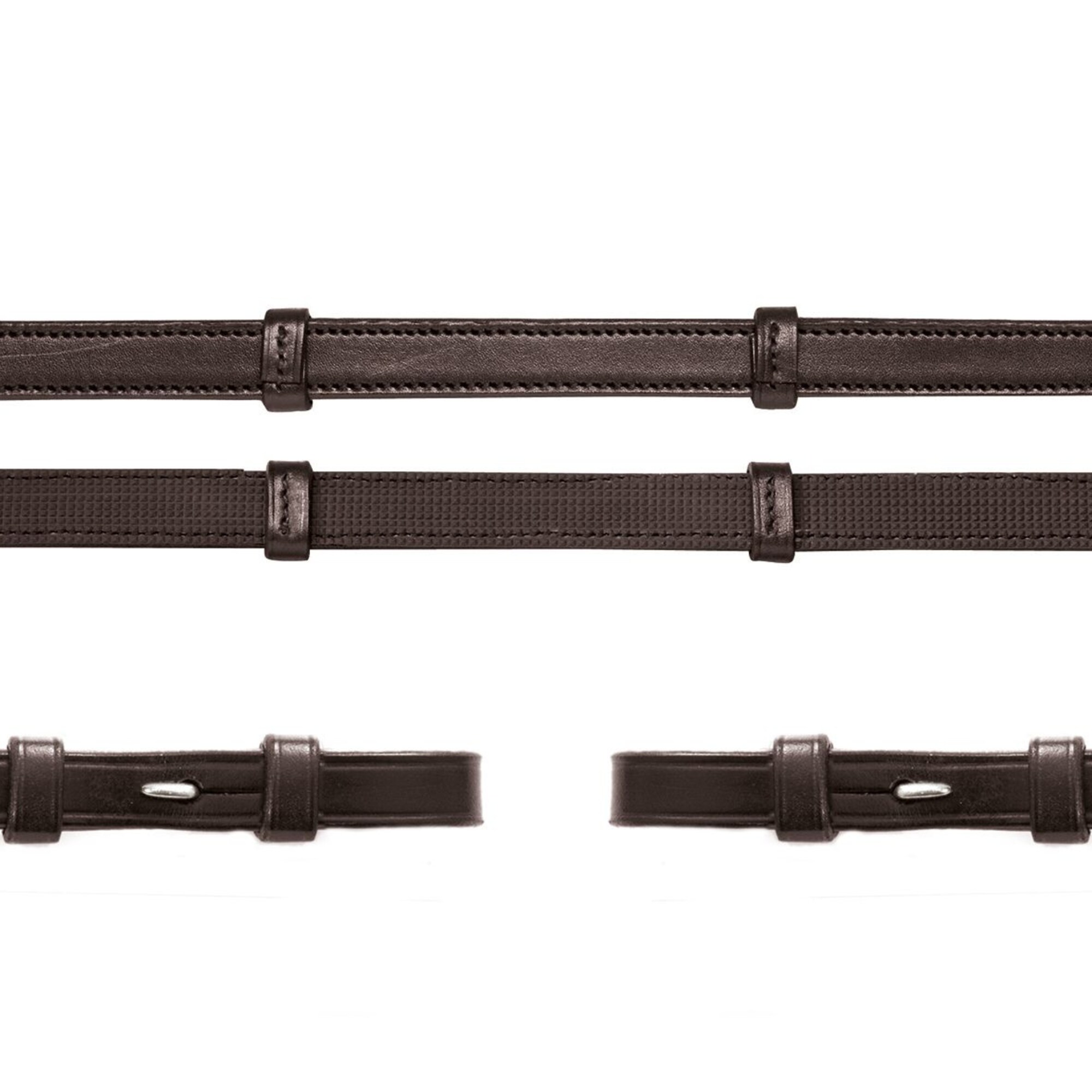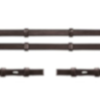 Die Zügel haben blinde Schnallen und eignen sich auch für das Reiten mit Unterlegtrense.