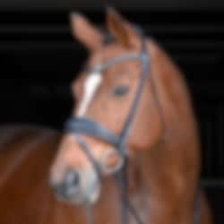 Die Hannibal Dressurtrense verfügt über ein elegant geschwungenes Stirnband mit silbernen Klinkersteinen, ein raffiniertes Detail, das den Gesamteindruck unterstreicht. Schnallen in dunklem Chrom sorgen für einen dezenten und modernen Look, während das E-Logo am Stirnband eine exklusive Note verleiht.