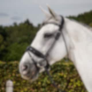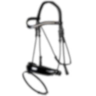 Das Genickstück der Trense ist anatomisch gestaltet und bietet ausreichend Platz für die Ohren. Die Backenstücke werden an den Seiten festgemacht, um den Druck zu verringern. Das Genickstück dieser Trense ist außerdem mit Neopren gepolstert und mit weichem Lammfell (ohne Fell) gefüttert. Die rundgenähten Trensen der Dyón Dressage Collection werden mit Stirnbändern mit Strasssteinen geliefert.