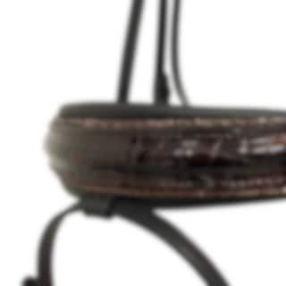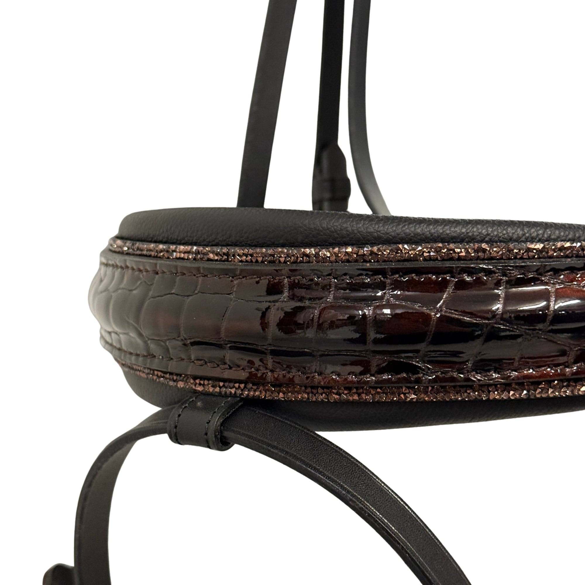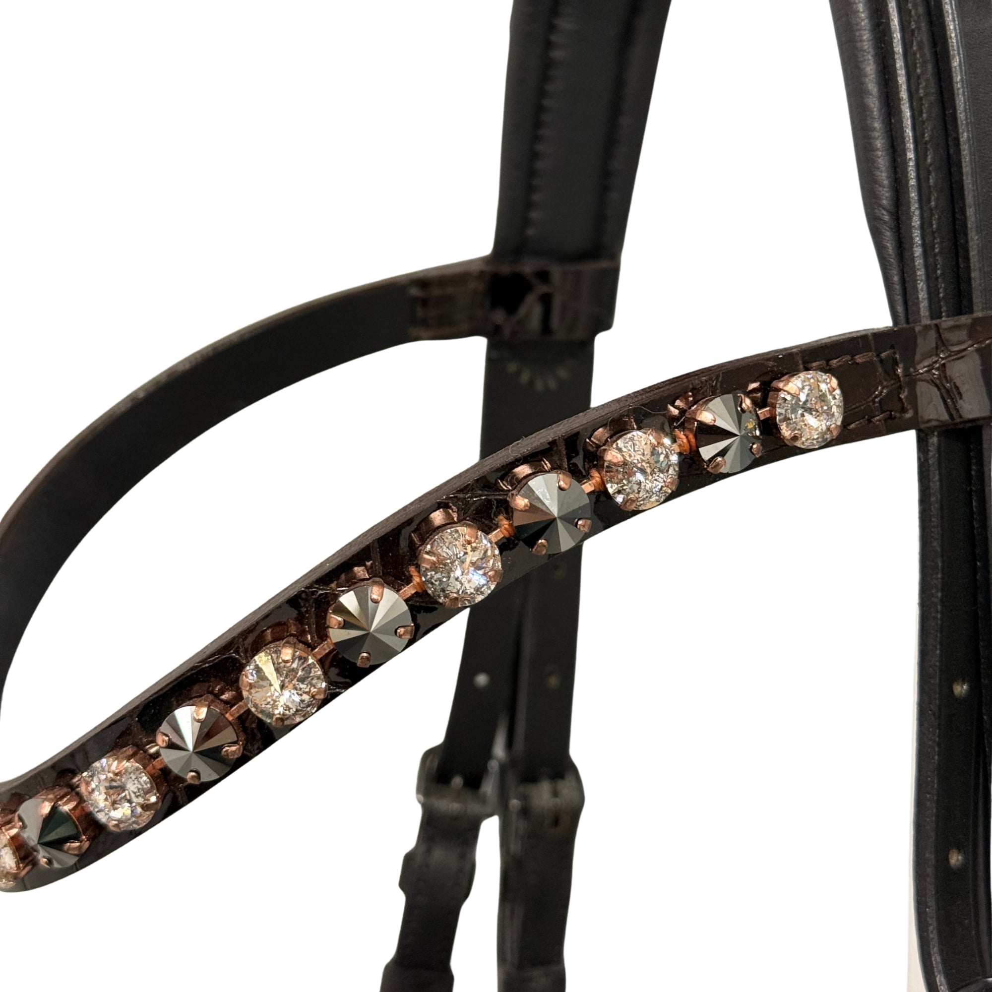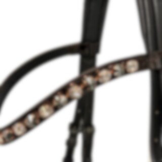Die Trense ist aus schwarzem, glattem Leder mit schwarzer Polsterung gefertigt. Das Stirnband besticht durch eine wunderschön geschwungene Form und ist mit Rivoli XL-Steinen (10 mm) besetzt - abwechselnd in Jet Hematite und Rose Patina. Zusätzlich ist das Stirnband mit braunem Croco-Lack sowie roséfarbenen Fassungen verziert.