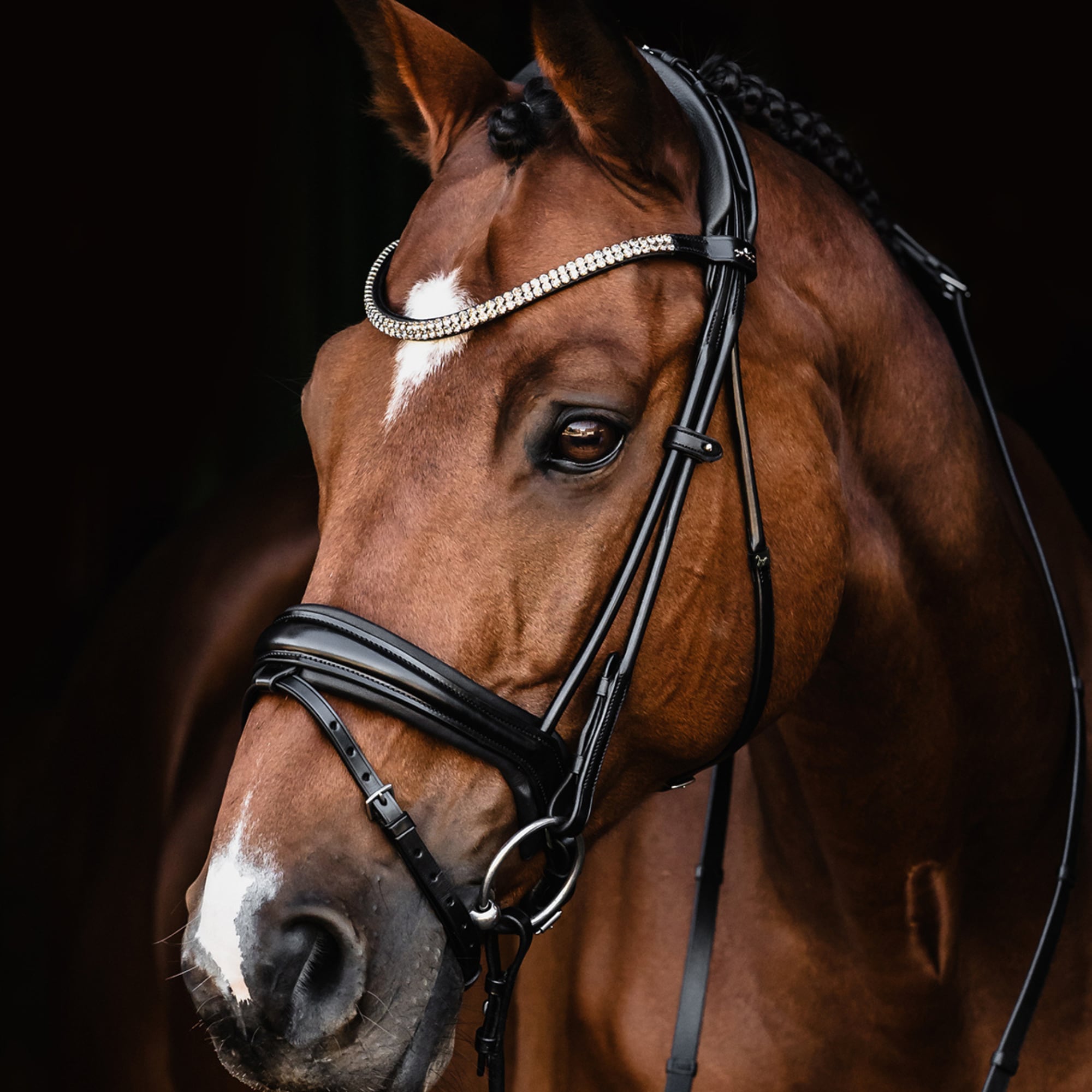 Die Trense Satchmo aus der exklusiven Isabell-Werth-Kollektion von Schockemöhle Sports ist anatomisch geformt und für optimalen Komfort und perfekte Passform entwickelt. Sie verfügt über rundgenähte Seitenteile, ein innovatives Kopfstück, das im Genick verstellbar ist, und ein schmales Stirnband, verziert mit zwei Reihen eleganter, quadratischer Kristalle. Das vorgeformte Reithalfter hat eine spezielle anatomische Polsterung, und die Trense verfügt über weich gepolsterte und eingebettete Ringe am Reithalfter [cut-back-Befestigung].