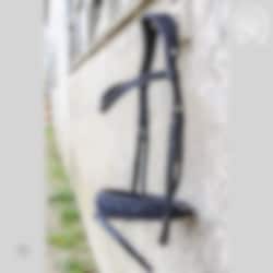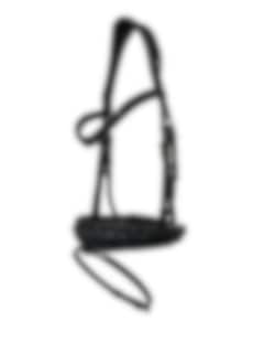 Sowohl das Genickstück als auch der Nasenriemen sind außen mit dem dekorativen Magarete-Leder versehen und der Nasenriemen hat zusätzlich eine Fineline-Paspelierung in schwarz funkelndem Swarovski-Crush.