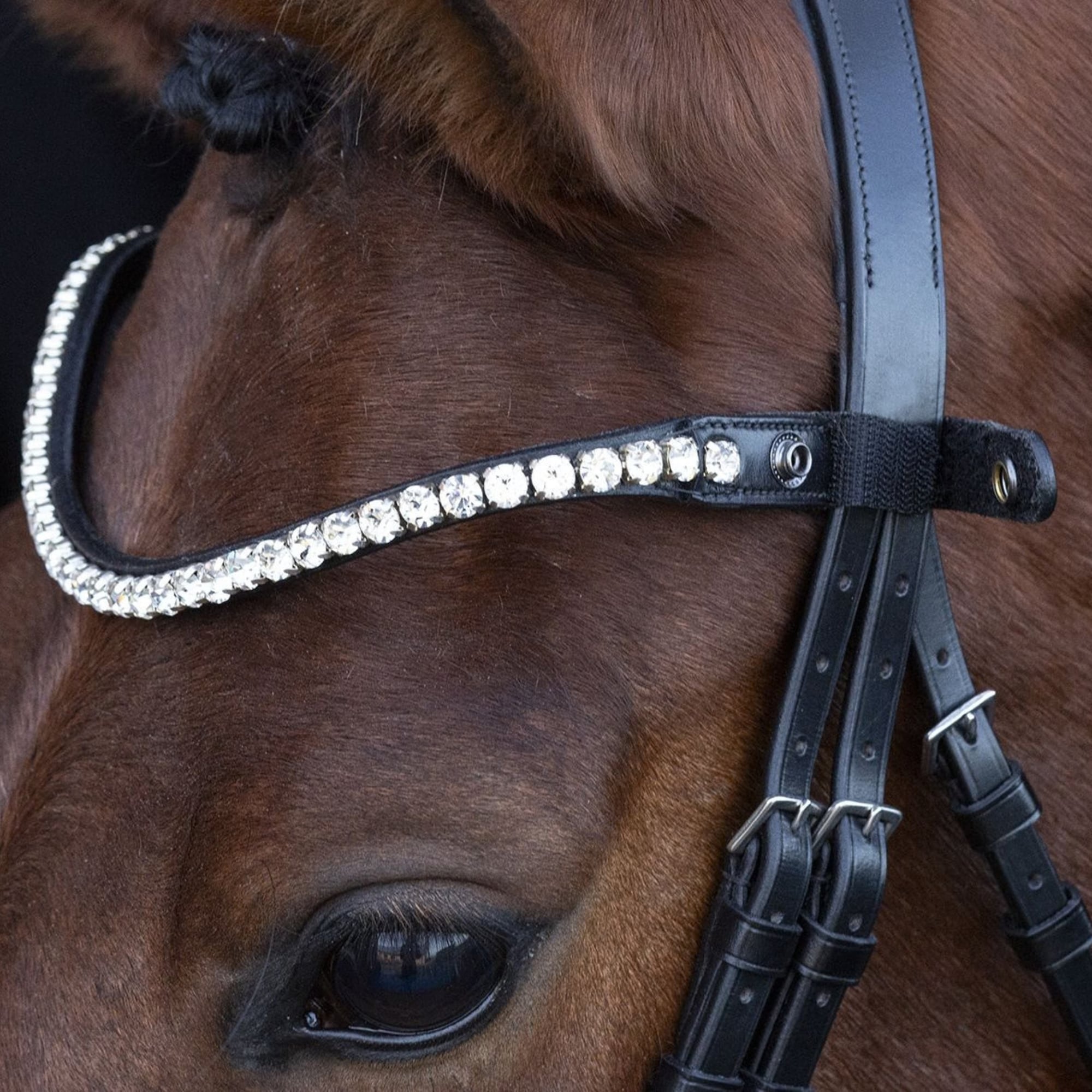 Auf der Rückseite des Nasenriemens, wo er geschlossen wird, sind die D-Ringe gepolstert, um zusätzlichen Komfort zu bieten. Das schmale Stirnband mit extra großen Kristallen kann dank Druckknopf und zusätzlicher Klettbefestigung einfach und bequem ausgetauscht werden.
