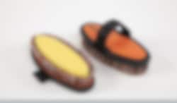 Die Bürste hat einen Schwamm in der Mitte und Borsten entlang der Kante. Die Waschbürste har einen Riemen über der Hand, was es einfacher macht, sie zu halten, während Sie das Pferd waschen.