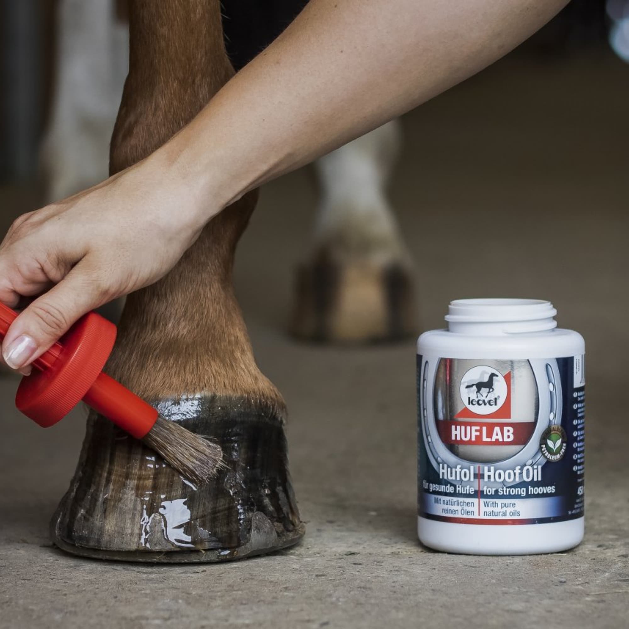 Leovet Hoof Lab Huföl 450 ml mit integriertem Pinsel.