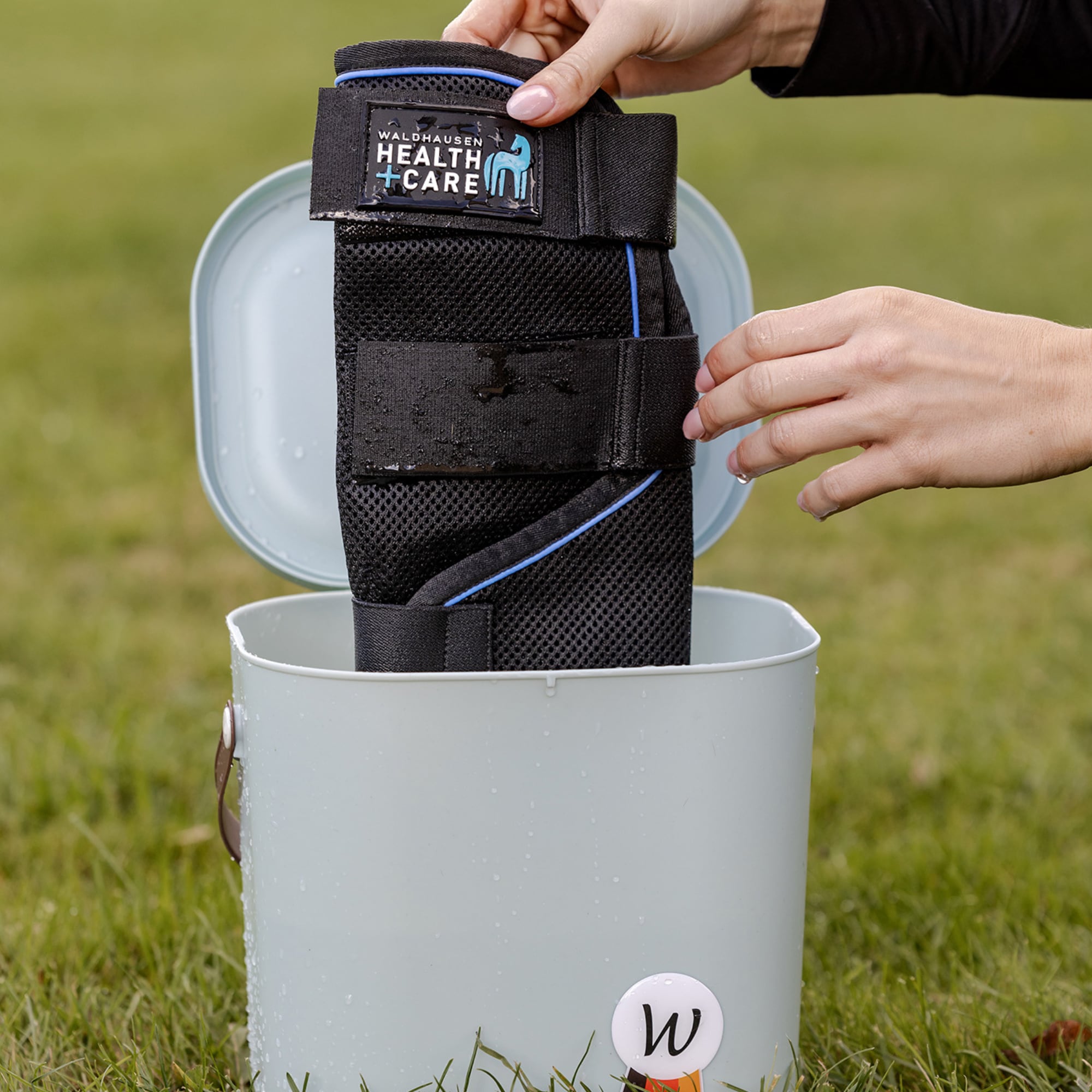 Die Gamaschen sind einfach zu verwenden: Legen Sie sie in einen Eimer mit Wasser, bis das Material vollständig durchnässt ist. Wringen Sie anschließend überschüssiges Wasser aus und legen Sie sie um die Beine des Pferdes.