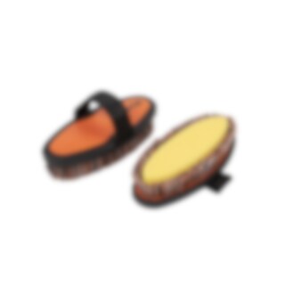 Die Bürste hat einen Schwamm in der Mitte und Borsten entlang der Kante. Die Waschbürste har einen Riemen über der Hand, was es einfacher macht, sie zu halten, während Sie das Pferd waschen.