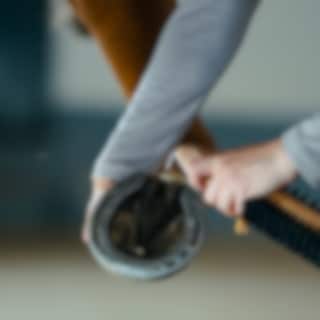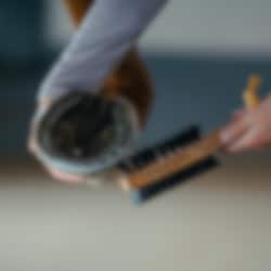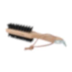 Multifunktionsbürste mit eingebautem Hufkratzer. Eine Seite mit weichen und eine Seite mit härteren Borsten. Die Hufbürste ist mit einem Holzgriff aus Buchenholz und einem praktischen Lederband ausgestattet.