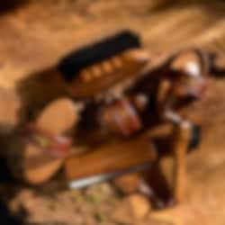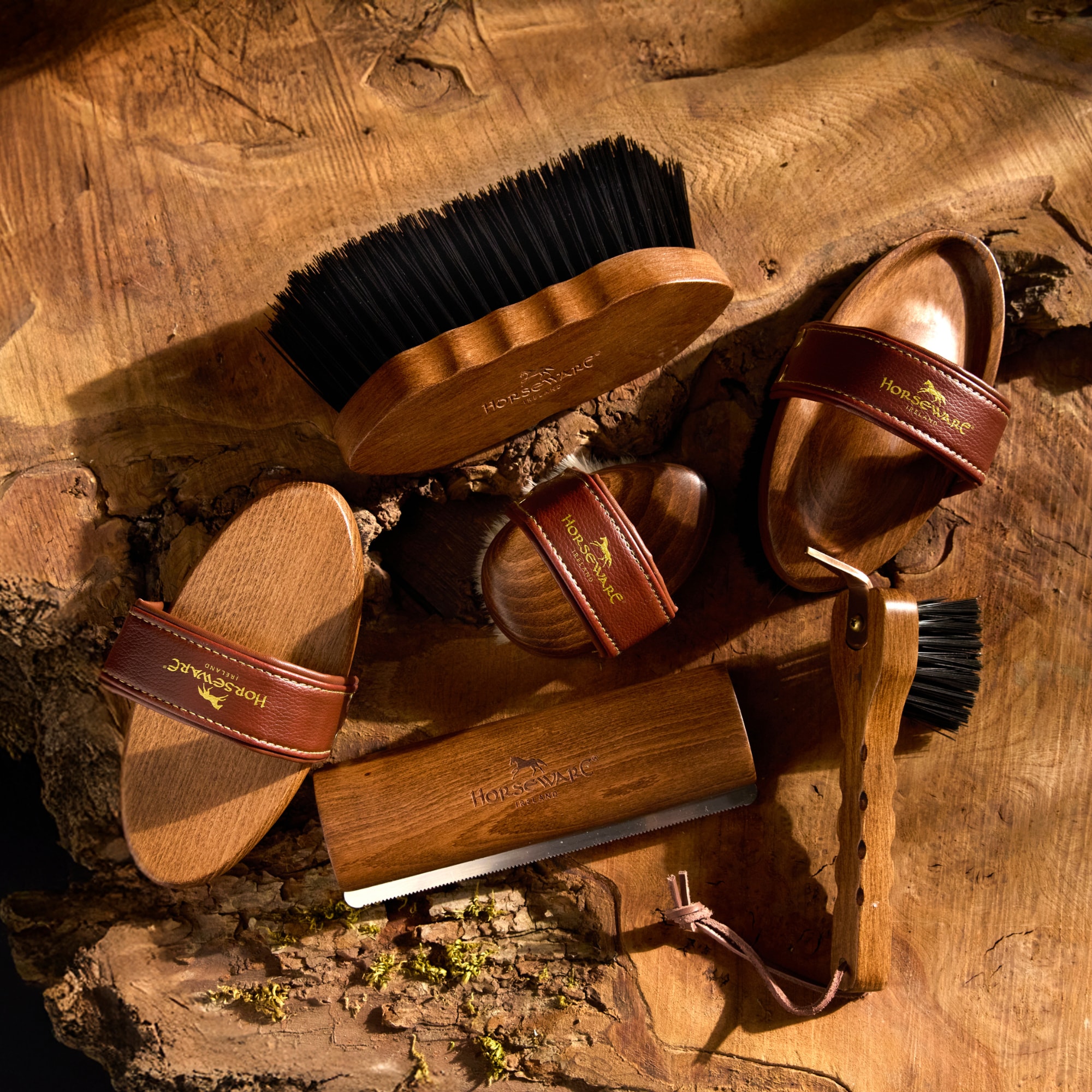 Die Bürste verfügt über einen ausgewogenen, handgefertigten Holzkörper sowie einen komfortablen, wasserresistenten Griff aus PU-Leder mit eleganten Goldnähten und -details sowie einem geprägten Horseware-Logo für eine stilvolle und exklusive Optik.