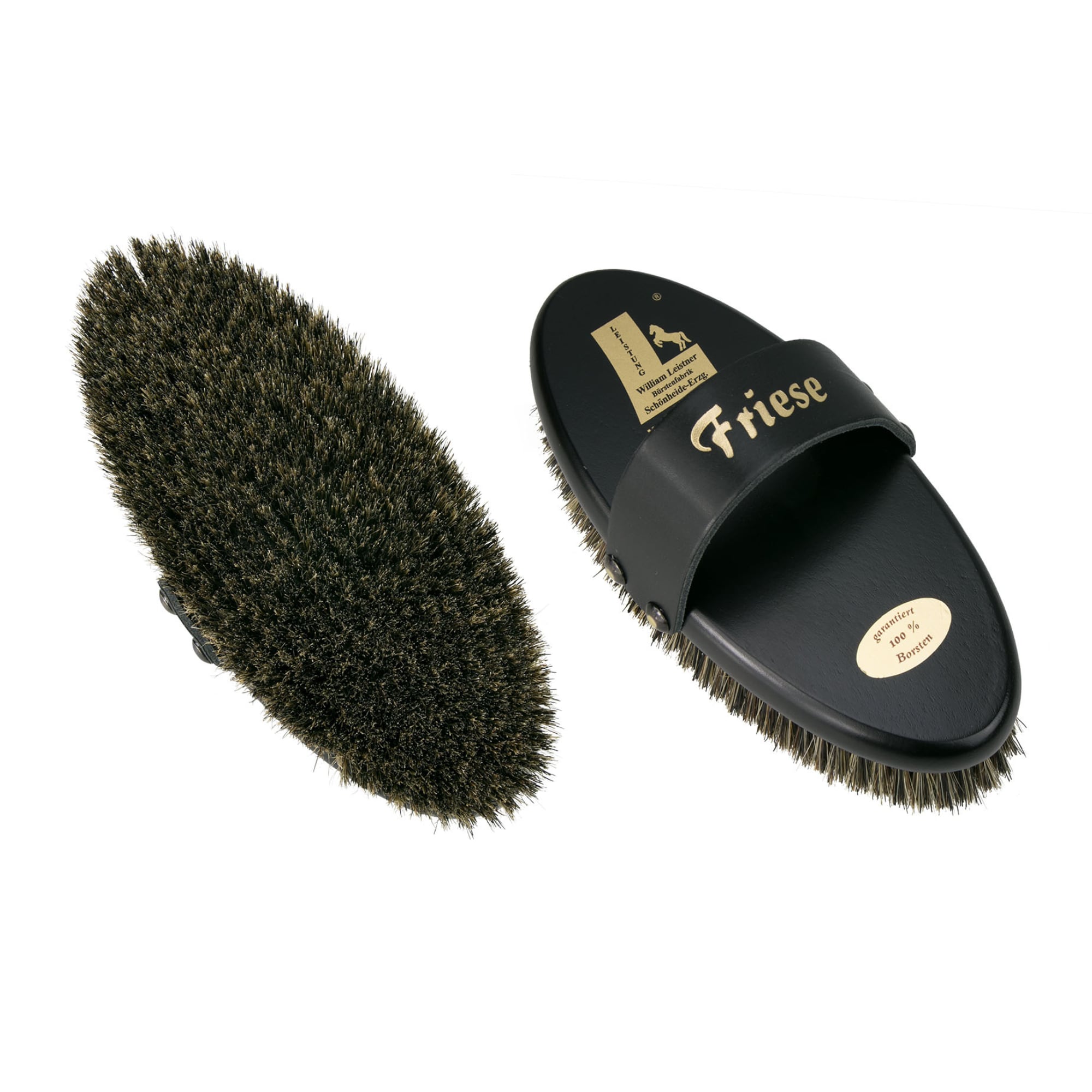 Die Kardätsche Friese kombiniert effektive Reinigung mit einer schonenden und angenehmen Massage für das Pferd. Stark verschmutztes Fell wird dank der festen Borsten aus Schweineborsten gründlich gereinigt. Diese verteilen zudem das natürliche Hautfett im Fell und sorgen dadurch für einen besonders schönen Glanz - insbesondere bei dunklem Fell. Da die Borsten aus natürlichen Materialien gefertigt sind, bleibt der Feuchtigkeitshaushalt des Fells erhalten und die Bildung von statischer Elektrizität wird minimiert.