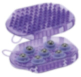 Massagestriegel mit magnetischen Massagerädern auf der einen Seite und kleinen Noppen auf der anderen Seite.