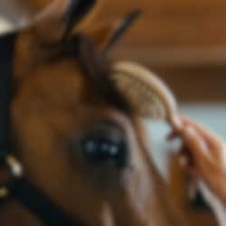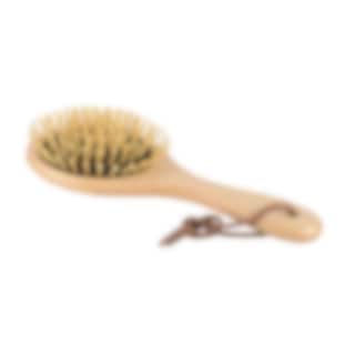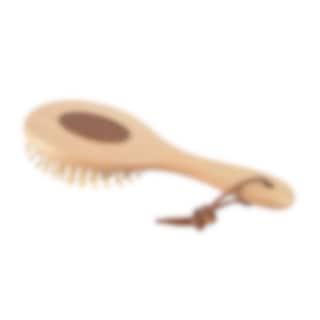 Die Massagebürste von Borstiq Farm kann auch als Haarbürste für Mähne und Schweif verwendet werden. Die Bürste ist aus Buchenholz gefertigt und hat einen angenehmen Griff und ein Lederband.