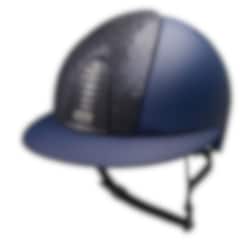 Der Reithelm Cromo 2.0 Matt Polo Inserto Glitter verfügt über eine matte marineblaue Außenschale, Rückseite, Schirm und Gitter. Schwarzer Inserto mit Glitzer auf der Front, schwarzer Frame und Sub-Grid sowie ein Button in Chrome-Ausführung und ein schwarzer Kinnriemen aus Leder.