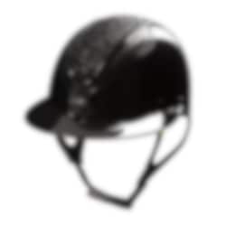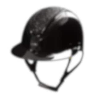 Schwarzer, glossy Reithelm mit MIPS, Glitzer-Top und Sonnenblende - der Lami-Cell Amelia MIPS bietet eine perfekte Balance zwischen Stil, Komfort und Schutz und ist damit eine ausgezeichnete Wahl für Reiterinnen und Reiter aller Erfahrungsstufen.