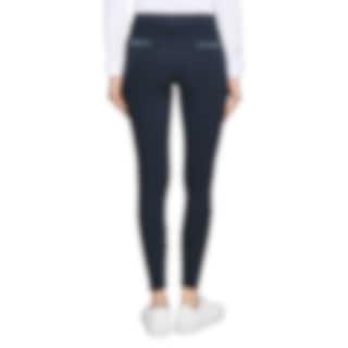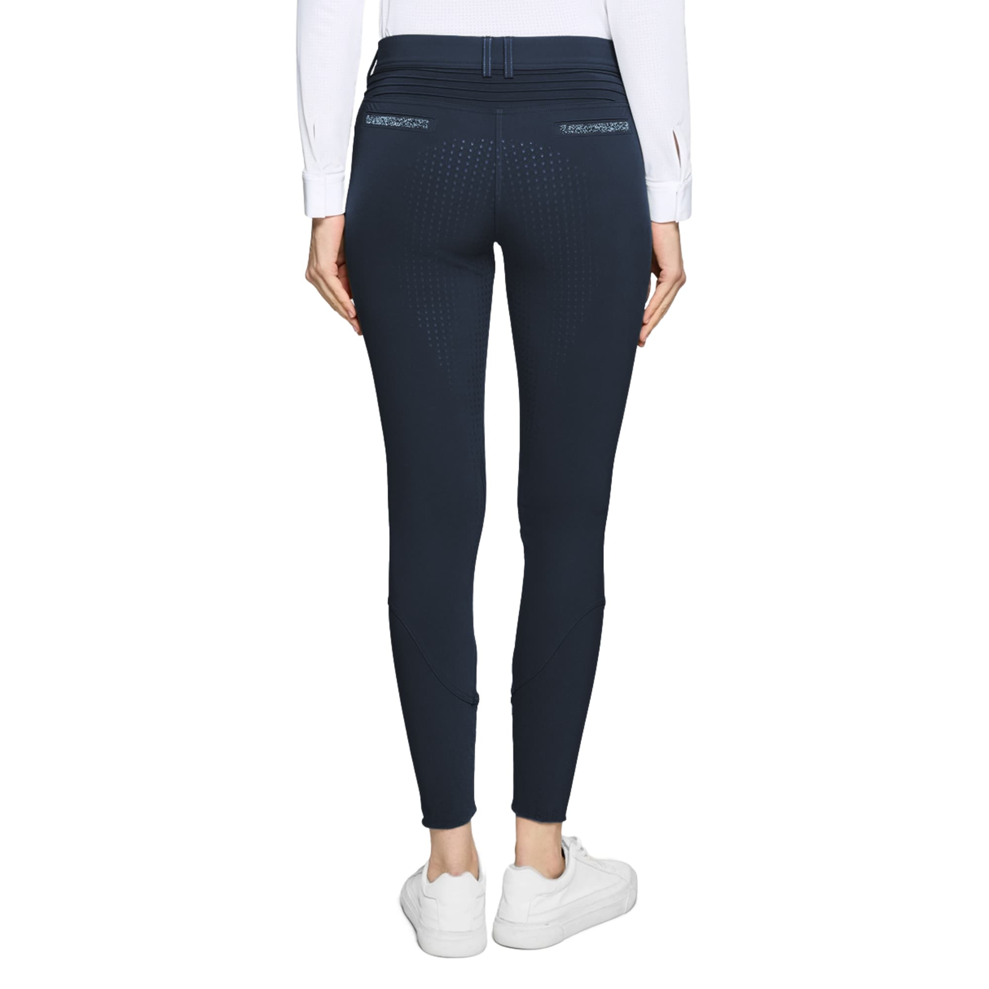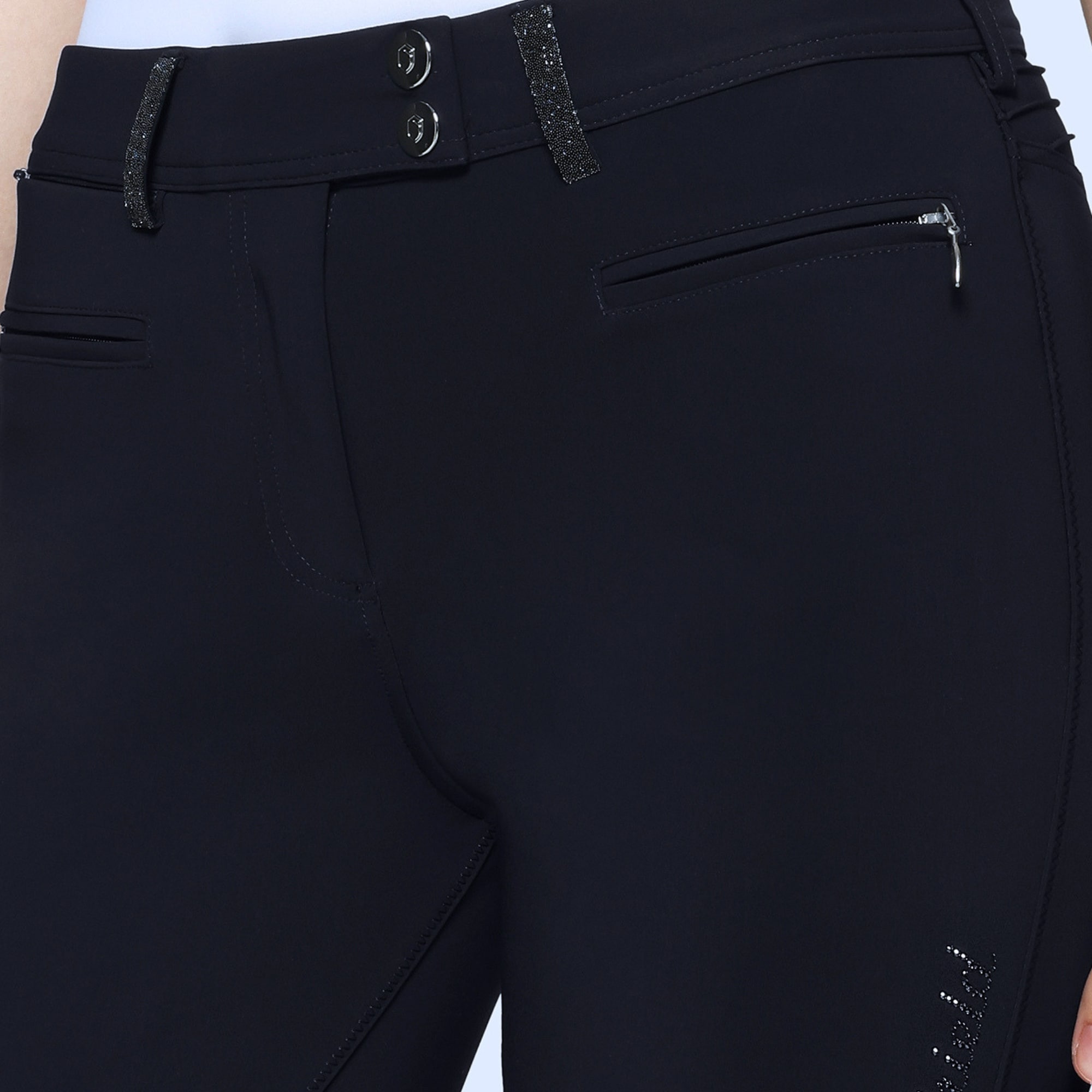 Marineblaue Samshield Diane Reithose für Damen aus einem anschmiegsamen, elastischen Funktionsmaterial mit eleganten Swarovski-Kristallen auf den Gesäßtaschen, am Oberschenkel und an den Gürtelschlaufen.