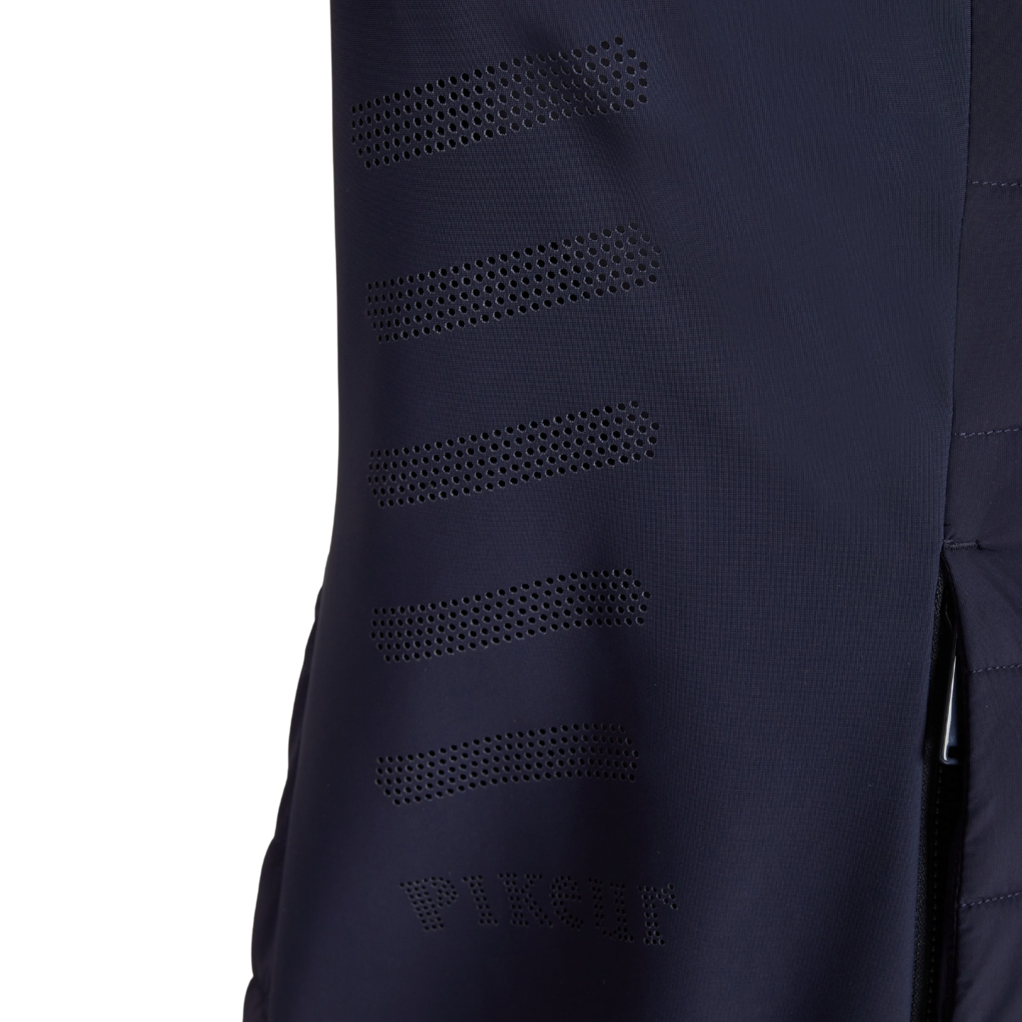 Die Hybridjacke von Pikeur hat eine Vorder- und Rückseite aus 4-Wege-Stretch sowie Seiteneinsätze aus Softshell mit lasergeschnittenen Details, die für zusätzliche Belüftung sorgen. Die Materialwahl macht die Jacke sowohl windresistent als auch wasserabweisend, während sie gleichzeitig ihre Flexibilität beibehält. Die Jacke ist mit einem Zwei-Wege-Reißverschluss, verdeckten Seitentaschen mit Reißverschluss, einem Stehkragen sowie Einfassungen an den Säumen mit einer dezenten weißen Linie ausgestattet, die für ein sauberes und sportliches Finish sorgt.