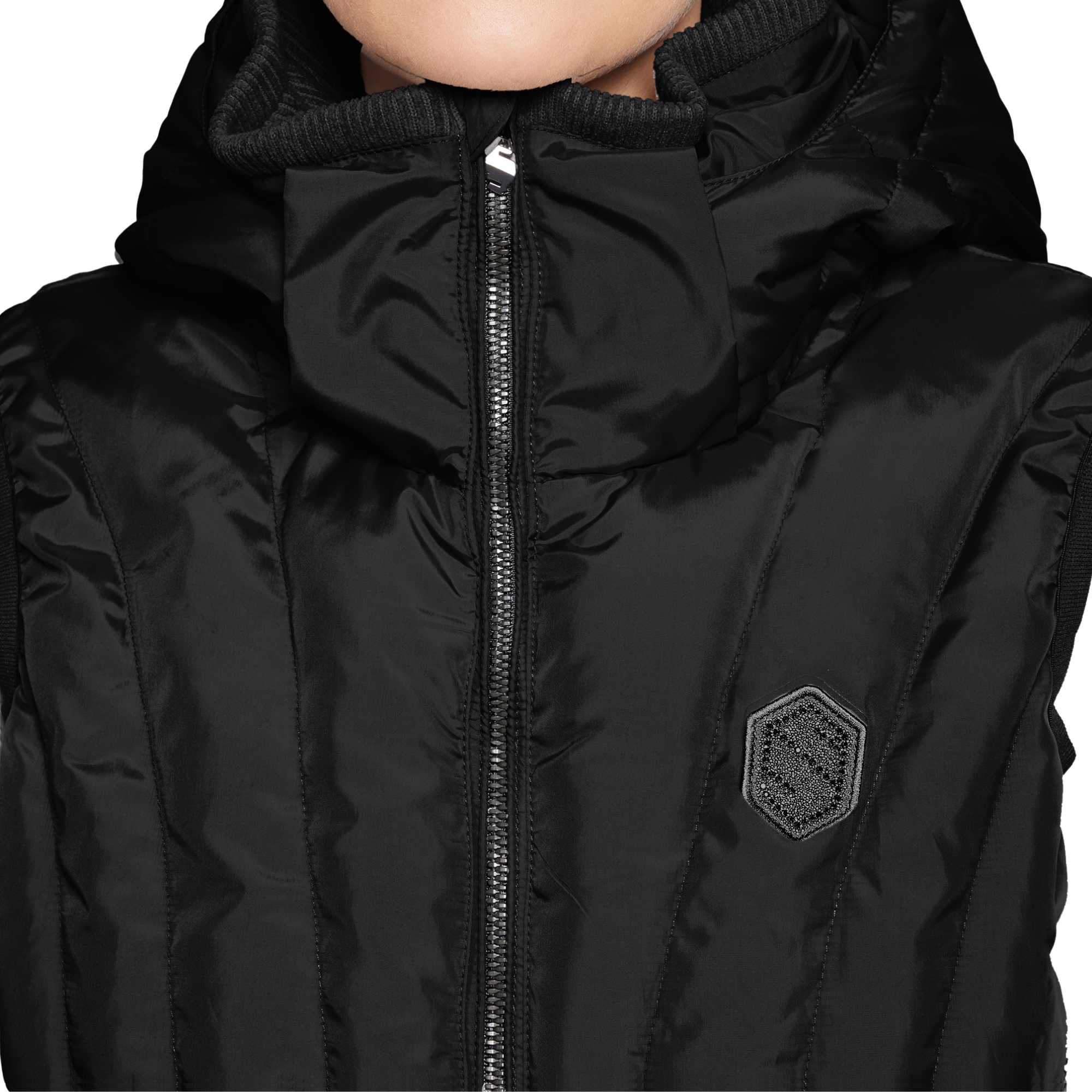 Die Reitweste hat eine schmeichelhafte Passform und ist auf der Brust mit dem Samshield-Logo aus Swarovski-Kristallen verziert. Ein robuster Zwei-Wege-Reißverschluss auf der Vorderseite sowie zwei Reißverschlusstaschen mit Fleecefutter bieten praktische Funktionalität.