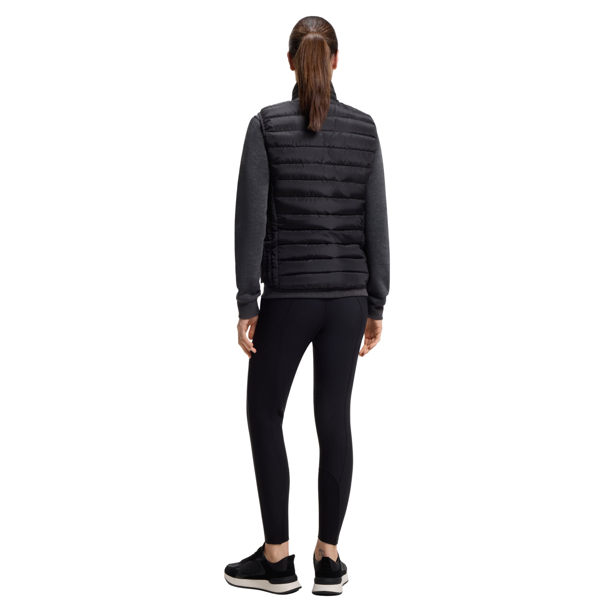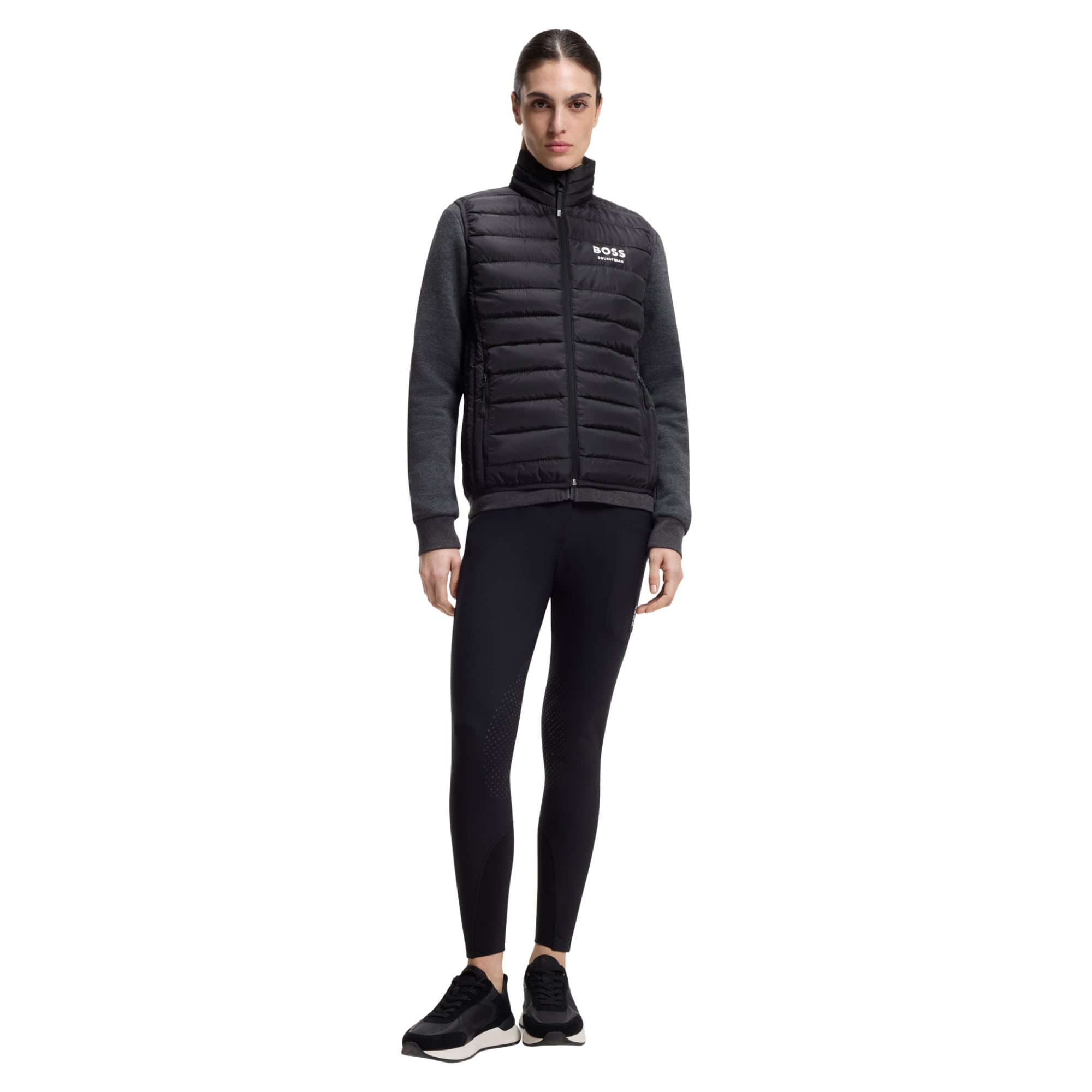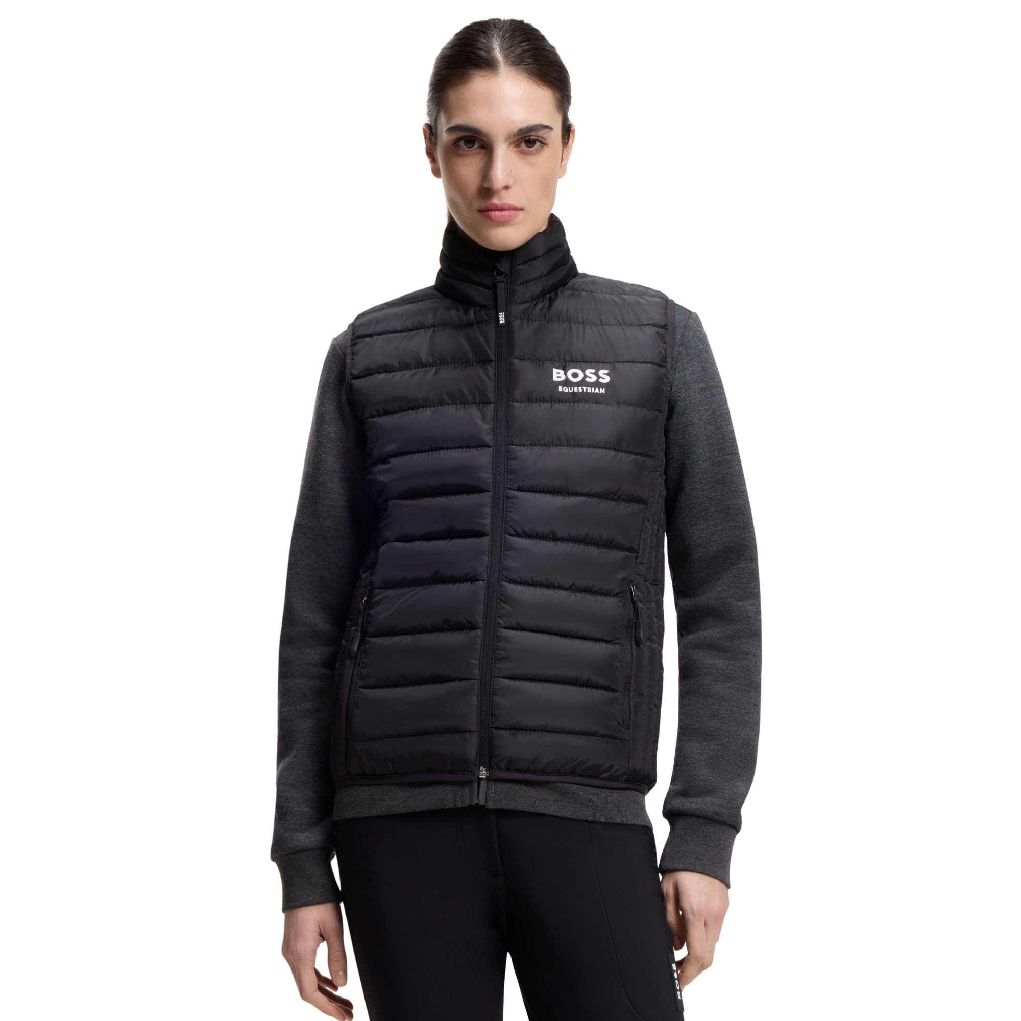 Die Weste ist mit praktischen seitlichen Reißverschlusstaschen, einem exklusiven Signature-Reißverschlussanhänger aus Silikon mit BOSS-Logo sowie einem stilvollen, gedruckten Boss Equestrian-Logo auf der Brust ausgestattet.
