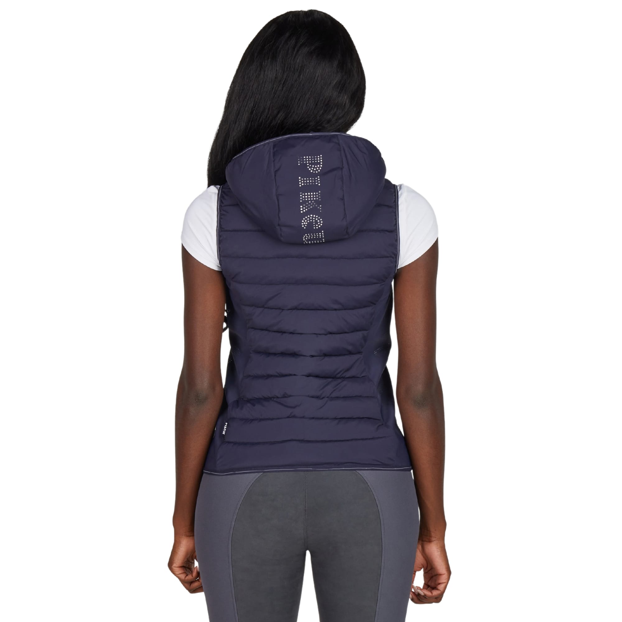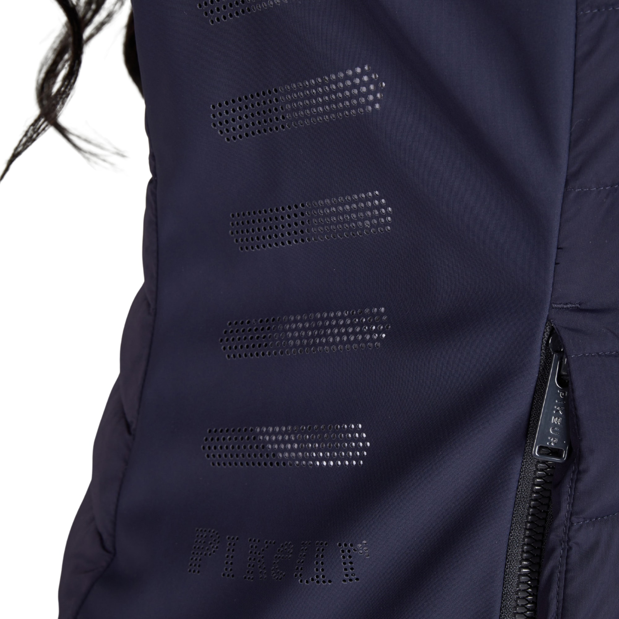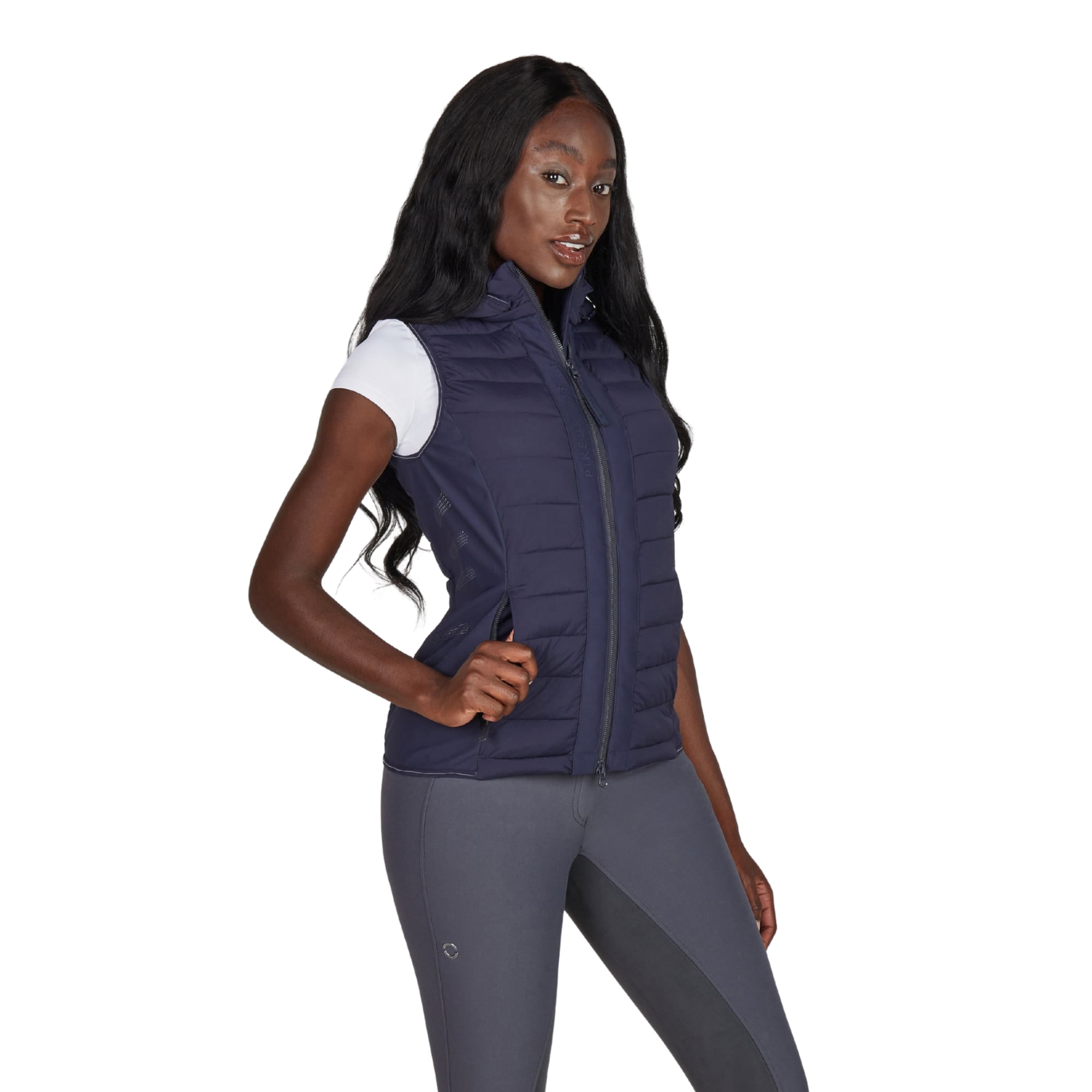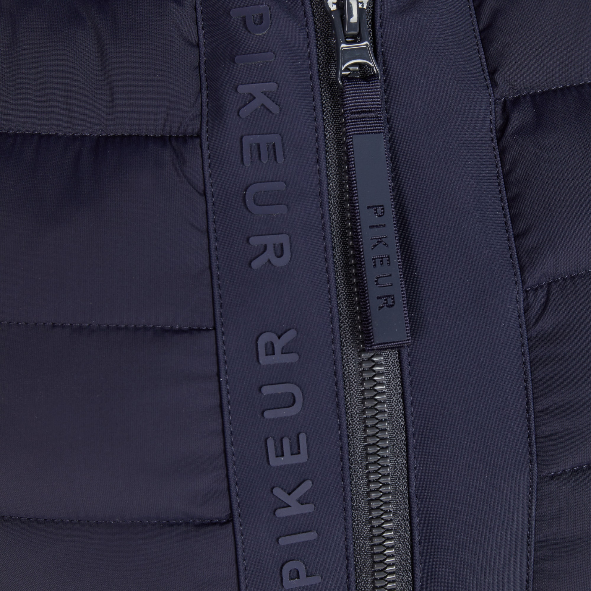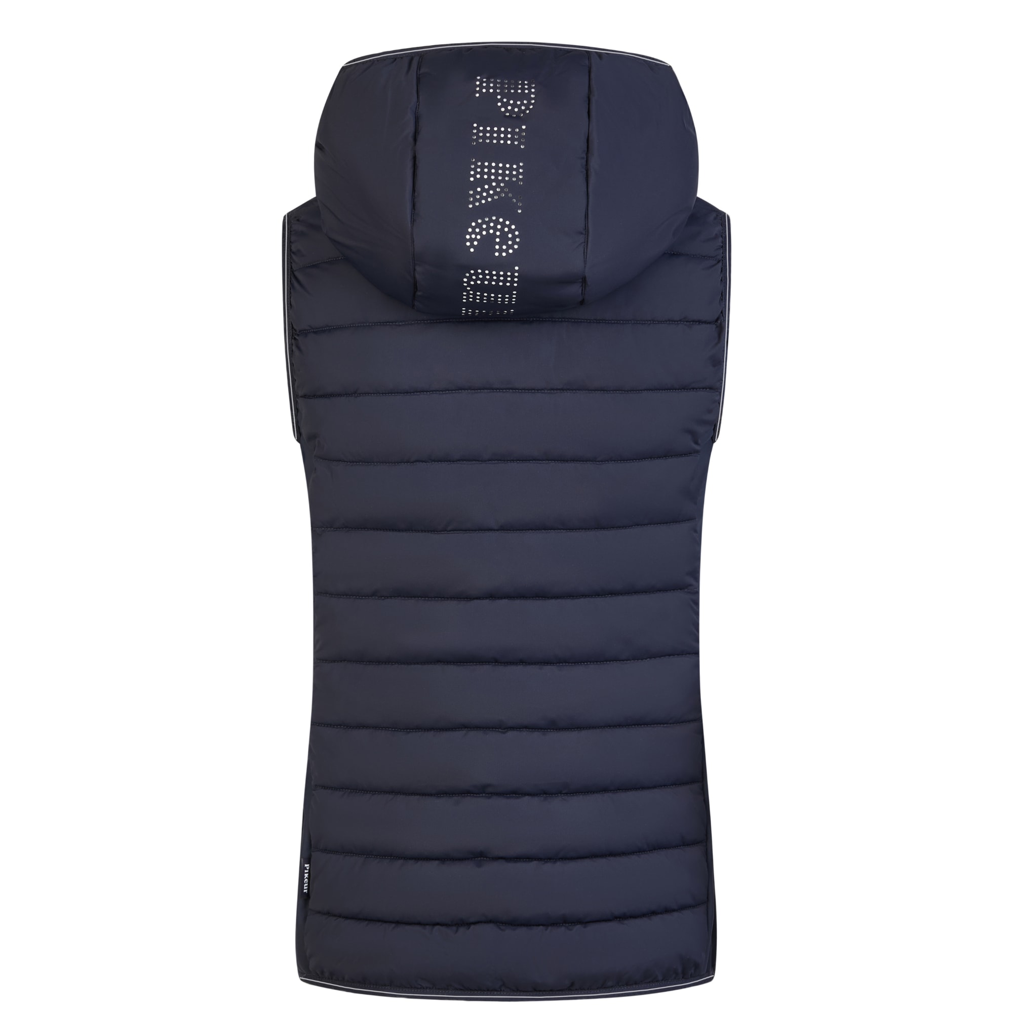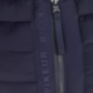 Die Weste wird vorne mit einem Zwei-Wege-Reißverschluss geschlossen und verfügt über verdeckte Seitentaschen mit Reißverschluss für ein klares Gesamtbild. Säume und Abschlüsse sind mit einem Ton-in-Ton-Paspelband mit Pikeur-Print versehen. Auf der Innenseite befindet sich ein Druck mit Piktogrammen, die die funktionellen Eigenschaften der Weste beschreiben.