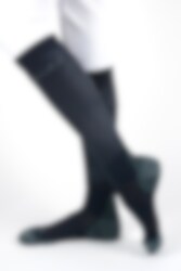 Balzane Reitstrümpfe sind ein Paar schlichte und bequeme Reitstrümpfe mit verstärkter Zehen- und Fersenpartie in Grau und mit dem Samshield-Logo oben auf der Socke, sowohl auf der Innen- als auch Außenseite.