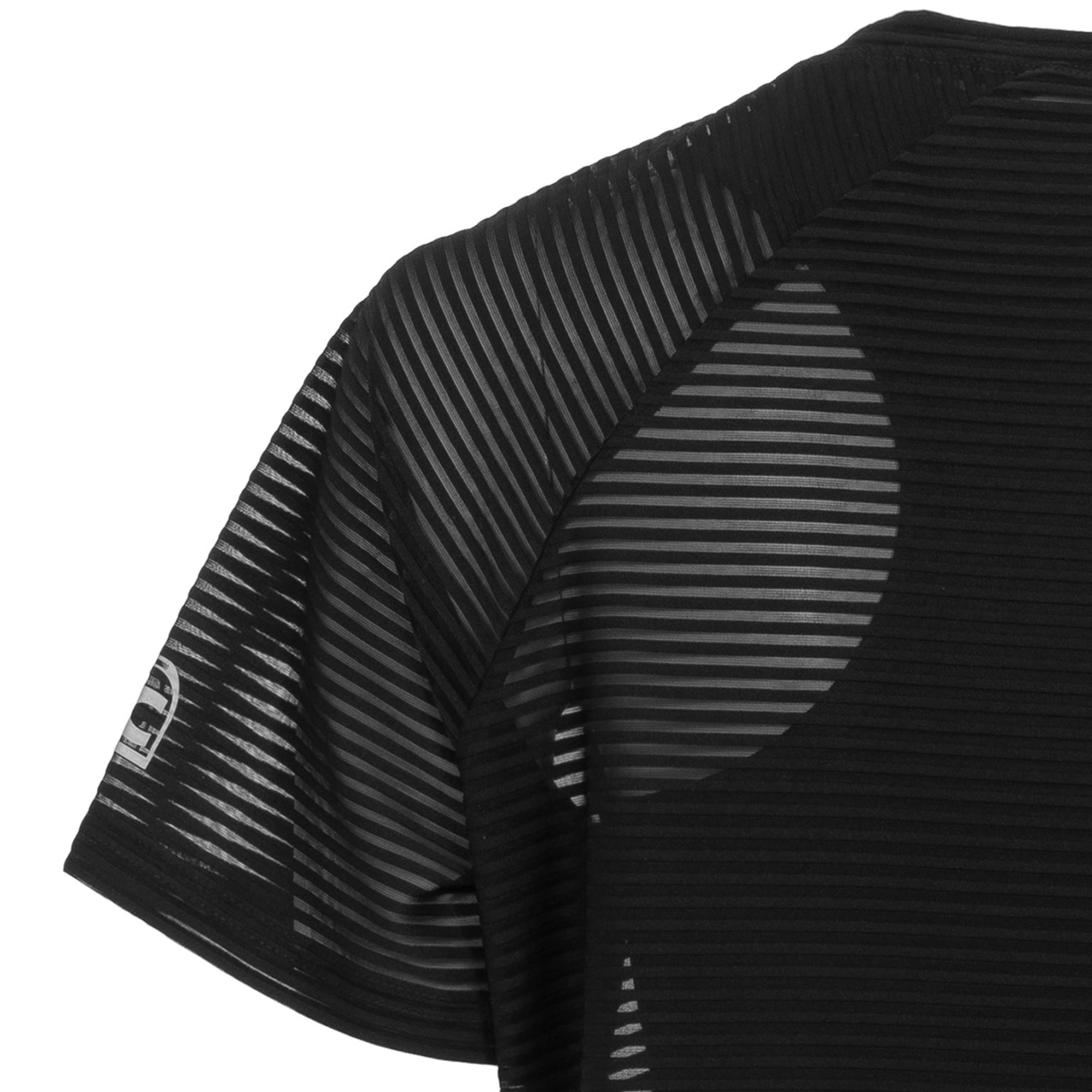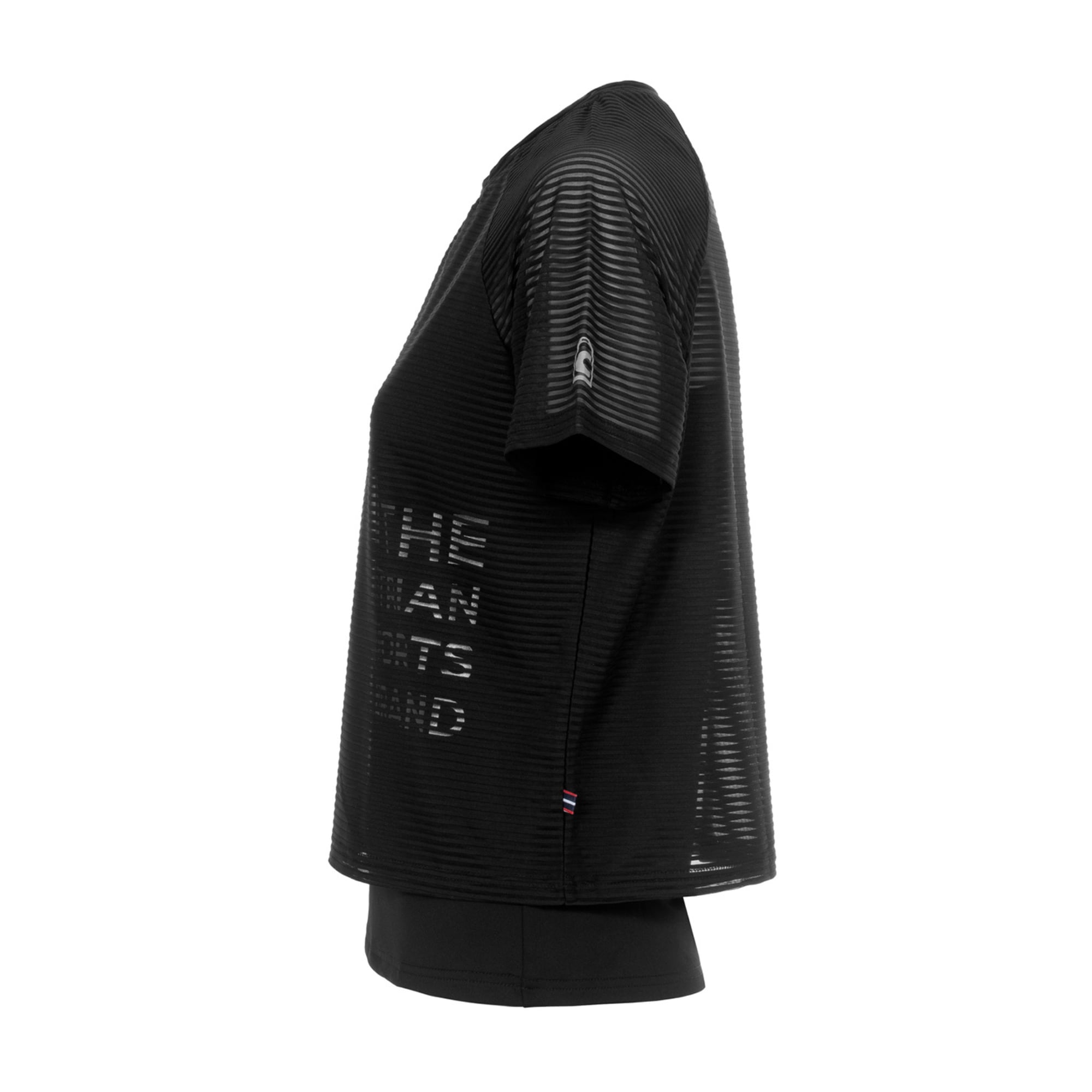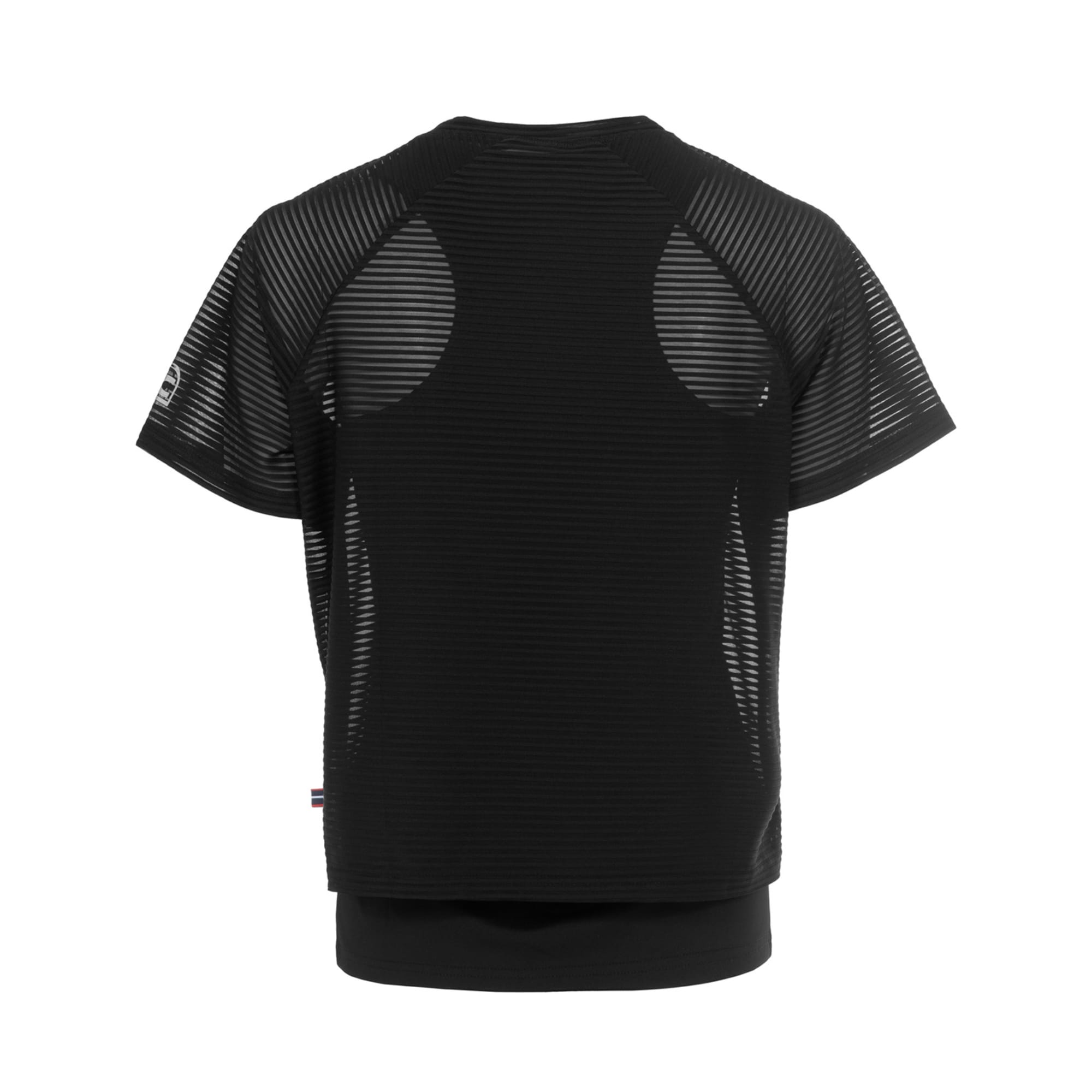 Cavalbelia T-Shirt von Cavallo ist ein funktionelles Trainingsshirt in Doppellagen-Design, bestehend aus einem kürzeren Oberteil mit kurzen Ärmeln und einer leicht transparenten, gestreiften Struktur. Darunter befindet sich ein längeres Top, das einen Layering-Effekt erzeugt und vorne mit einem großen Cavallo-Print versehen ist.