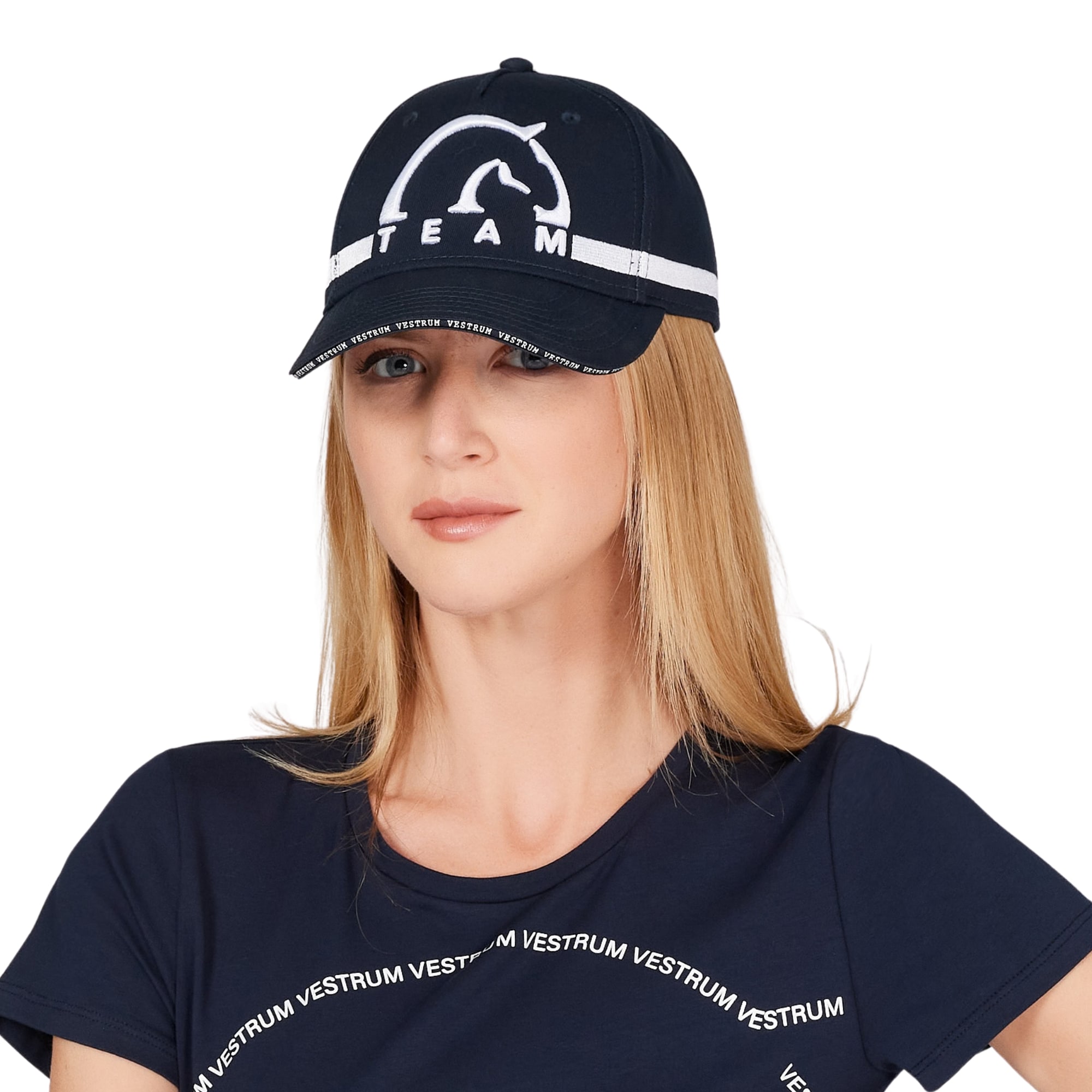 Die Kappe von Vestrum ist eine stilvolle und sportliche Kappe mit einem klaren weißen TEAM-Logo auf der Vorderseite, kombiniert mit Vestrums ikonischem Pferdesymbol und einem eleganten weißen Kontrastdetail rund um die Front der Kappe.