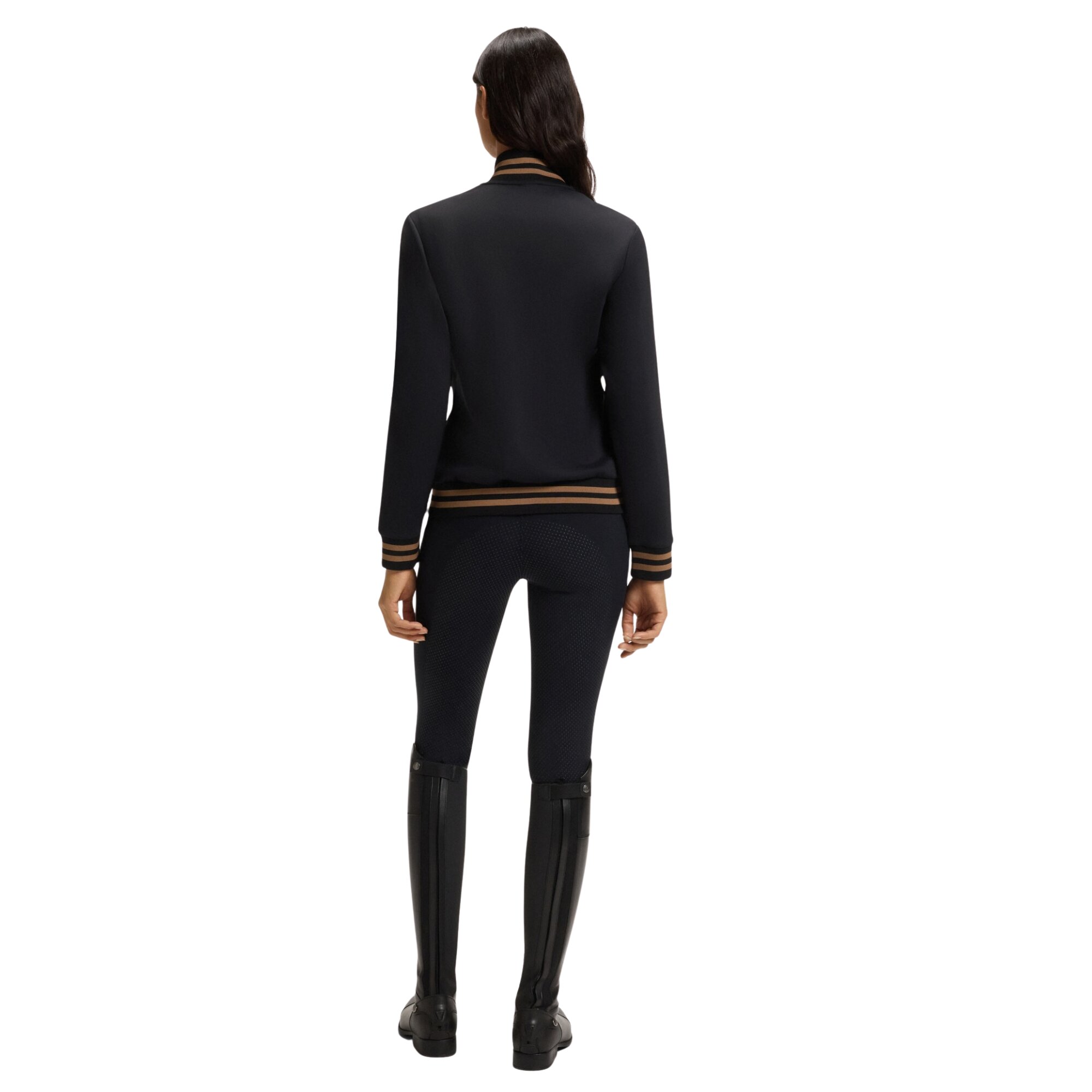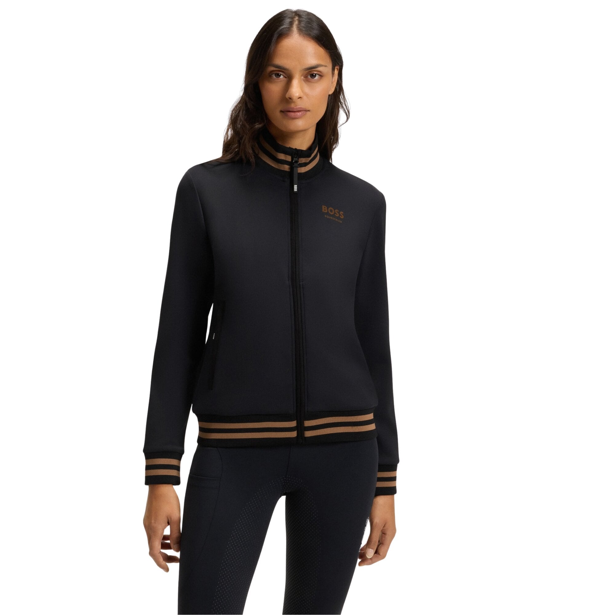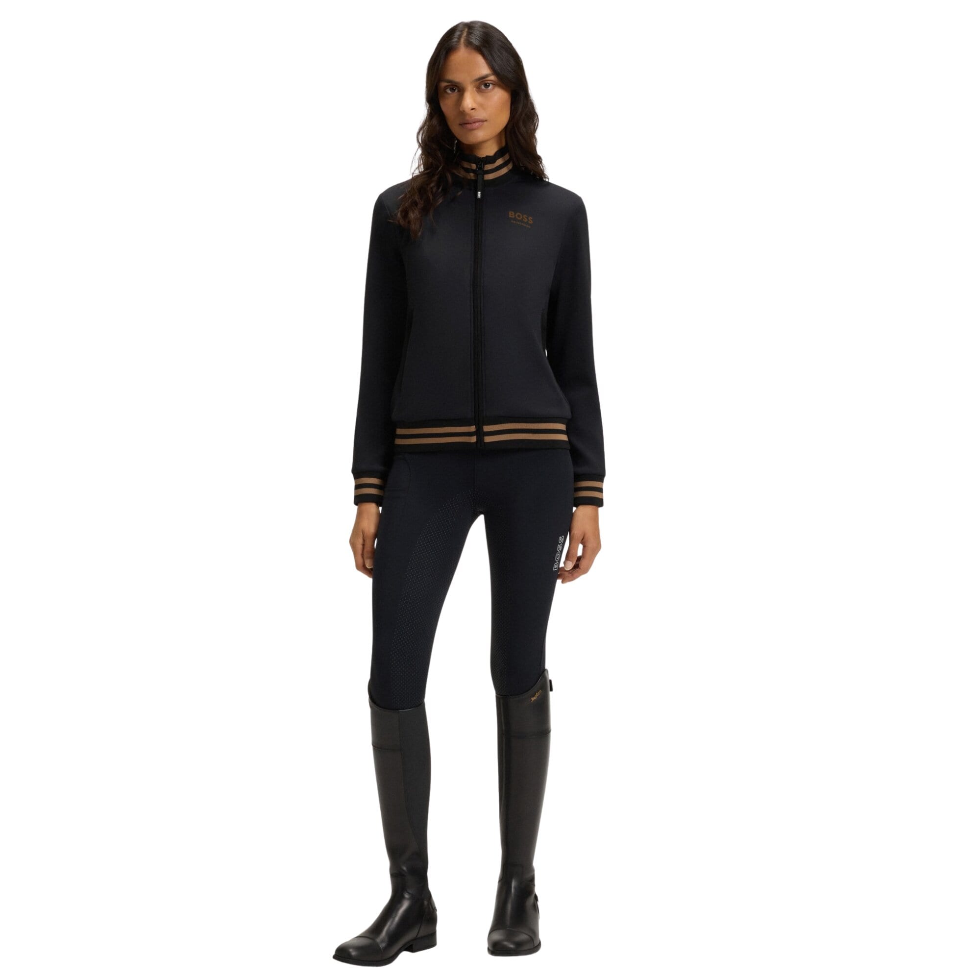 Ava Cardigan von BOSS Equestrian ist als funktionelles Second-Layer-Kleidungsstück mit einer anschmiegsamen und komfortablen Passform konzipiert. Das stilvolle schwarze Design wird durch kontrastierende Streifen an den gerippten Bündchen ergänzt, was für ein sportliches und exklusives Gefühl sorgt. Auf der Brust befindet sich das BOSS Equestrian-Logo. Ein vielseitiges Kleidungsstück, das Funktion, Komfort und Design kombiniert – ebenso stilvoll beim Reiten wie für einen entspannten Alltagslook.
