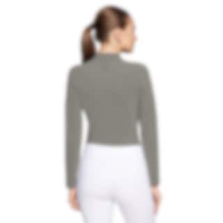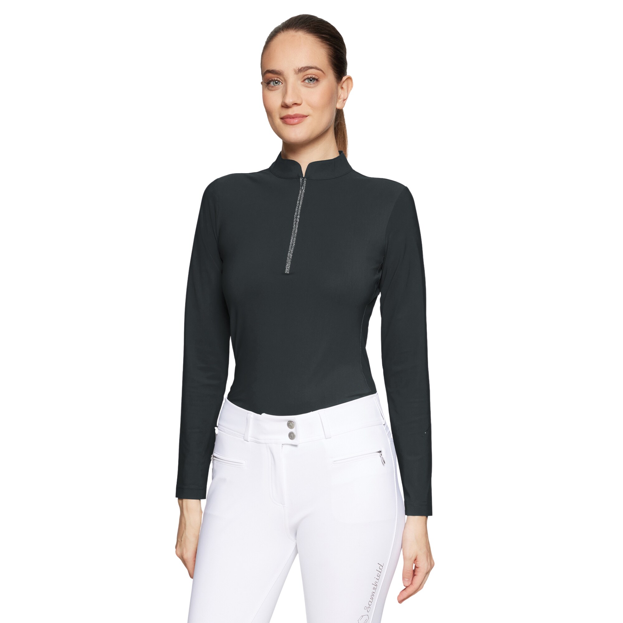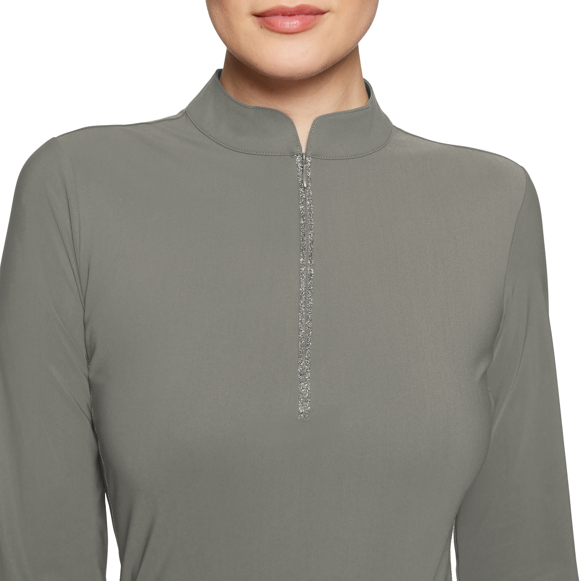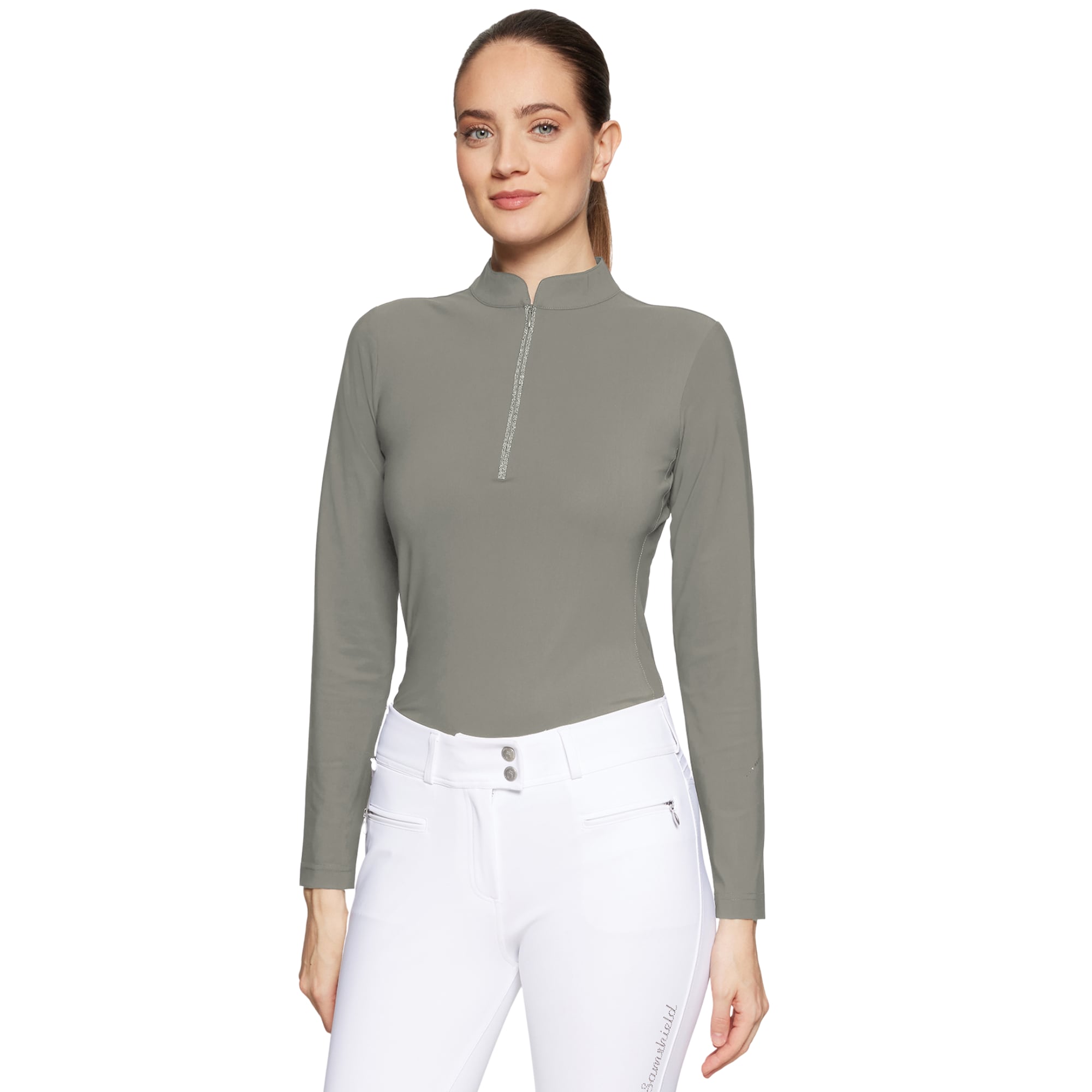 Das Brunella Reitshirt von Samshield in Sauge ist ein elegantes langärmliges Reitshirt mit Stehkragen und halbem Reißverschluss. Gefertigt aus atmungsaktivem, elastischem Funktionsmaterial und verziert mit schimmernden Swarovski®-Details.