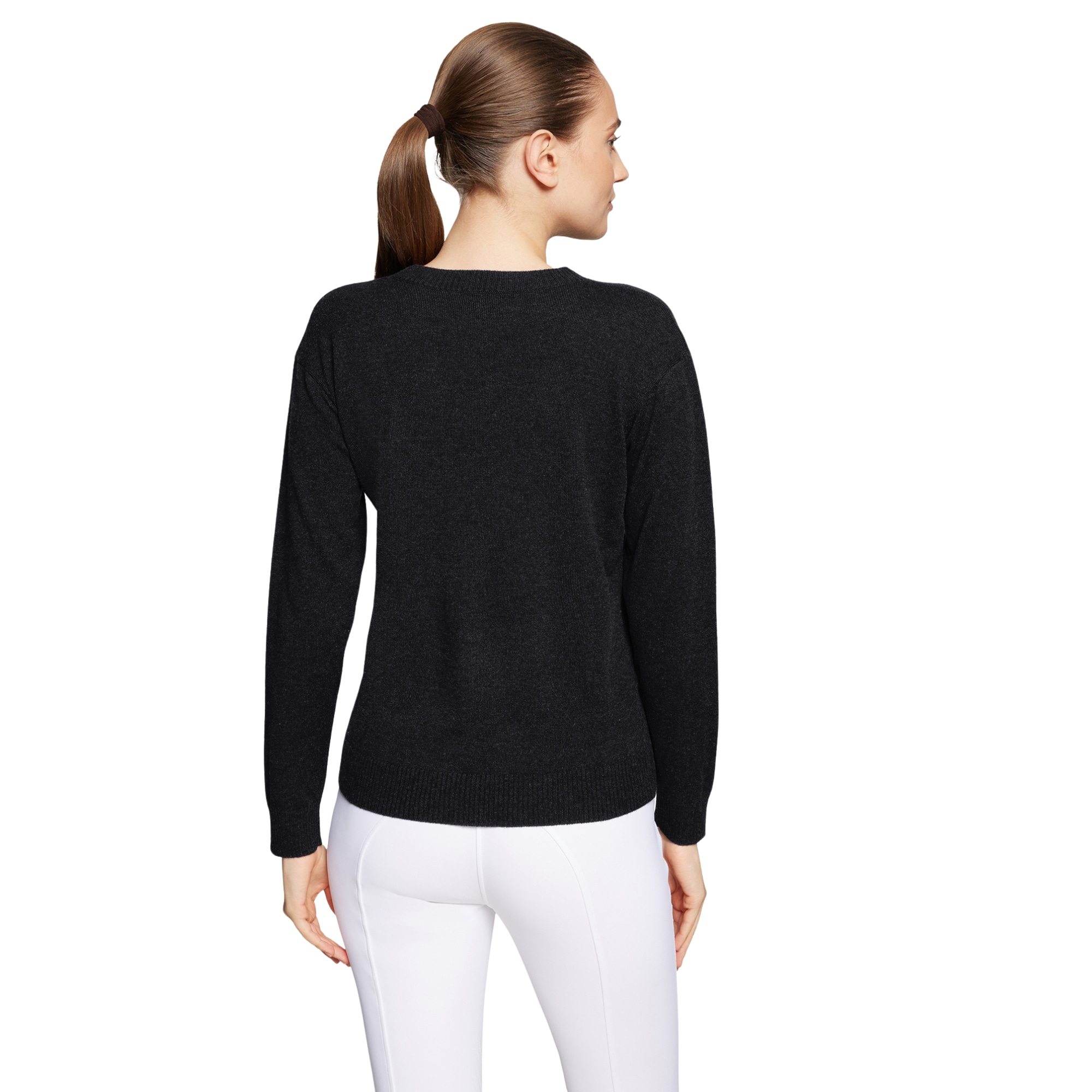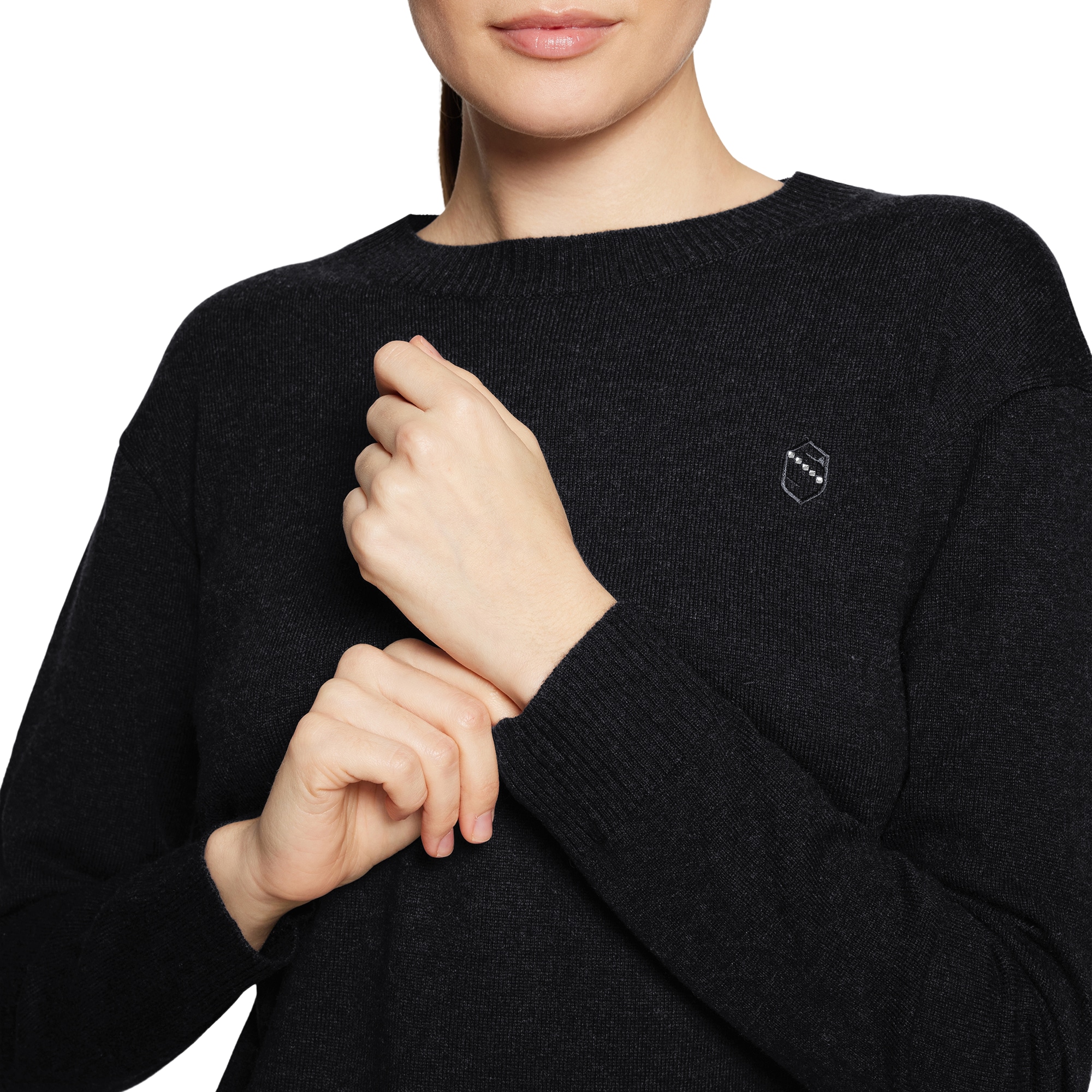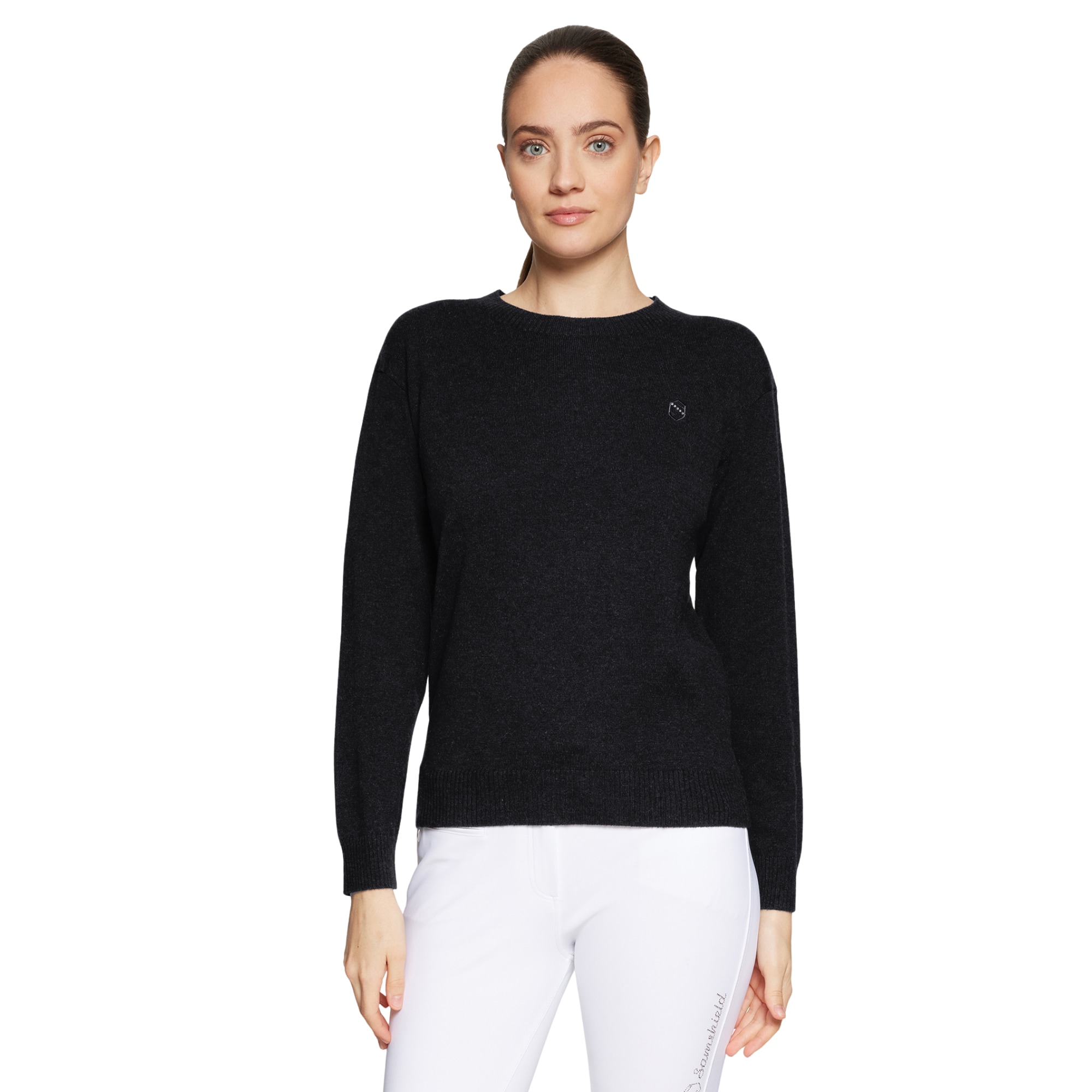 Eleganter Damenpullover Candice Pull Over in Schwarz von Samshield aus weicher Merinowolle und Kaschmir. Mit Rundhalsausschnitt, gerippten Details und dezenter Kristalldekoration vereint er klassischen Stil mit Komfort - perfekt für Stall und Alltag.