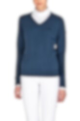 Dieser Pullover mit V-Ausschnitt aus feinem Strickmaterial ist in einer modernen, stilvollen Farbe namens Diplomatic Blue. Der Reitpullover ist dünn, weich und dehnbar und hat ein B-Move-Material an den Schultern. Er hat das klassische Logo mit den drei Pferden auf der Brust und ein Equiline-Logo auf dem Arm.