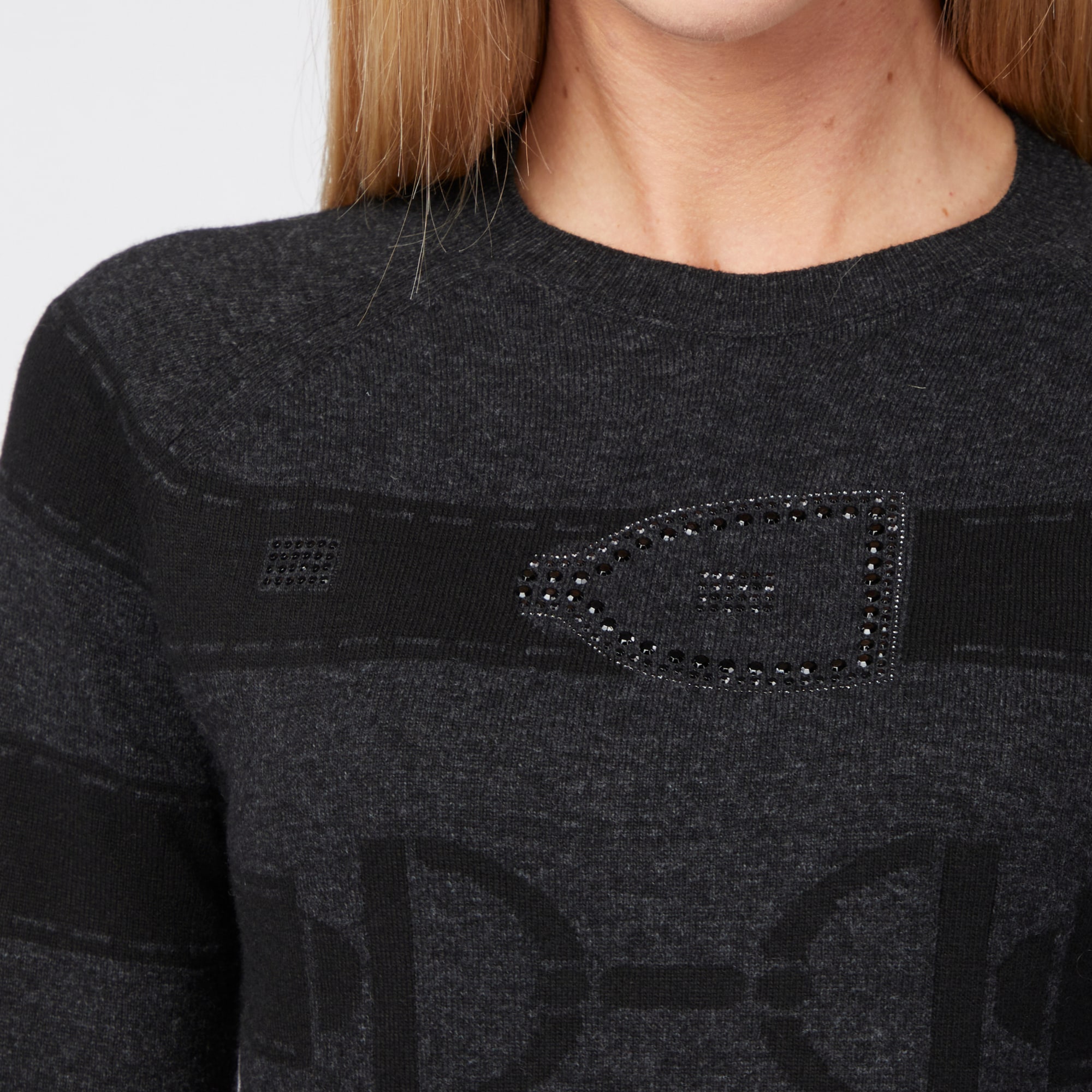 Der Vestrum Hanoi Knitwear in der Farbe Charcoal Black ist ein exklusiver Strick-Pullover mit dekorativem Zaumzeug- und Pferdemotiv in Schwarz, verziert mit stilvollen Nieten auf der Oberseite des Pullovers.