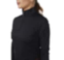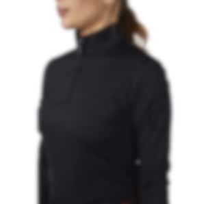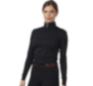 Das schwarze, langärmelige Reitshirt hat eine figurbetonte Passform und einen dehnbaren Stoff, der sich den Bewegungen des Körpers anpasst und so ein angenehmes und flexibles Tragegefühl vermittelt. Das dezente Vestrum-Logo auf der Brust und die eleganten Details machen das Reitshirt ebenso stilvoll wie funktional, perfekt für Training und Alltag.