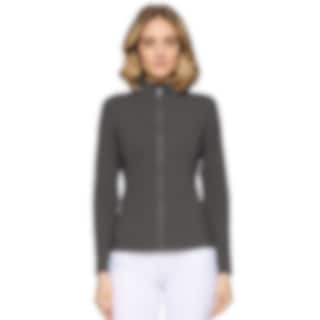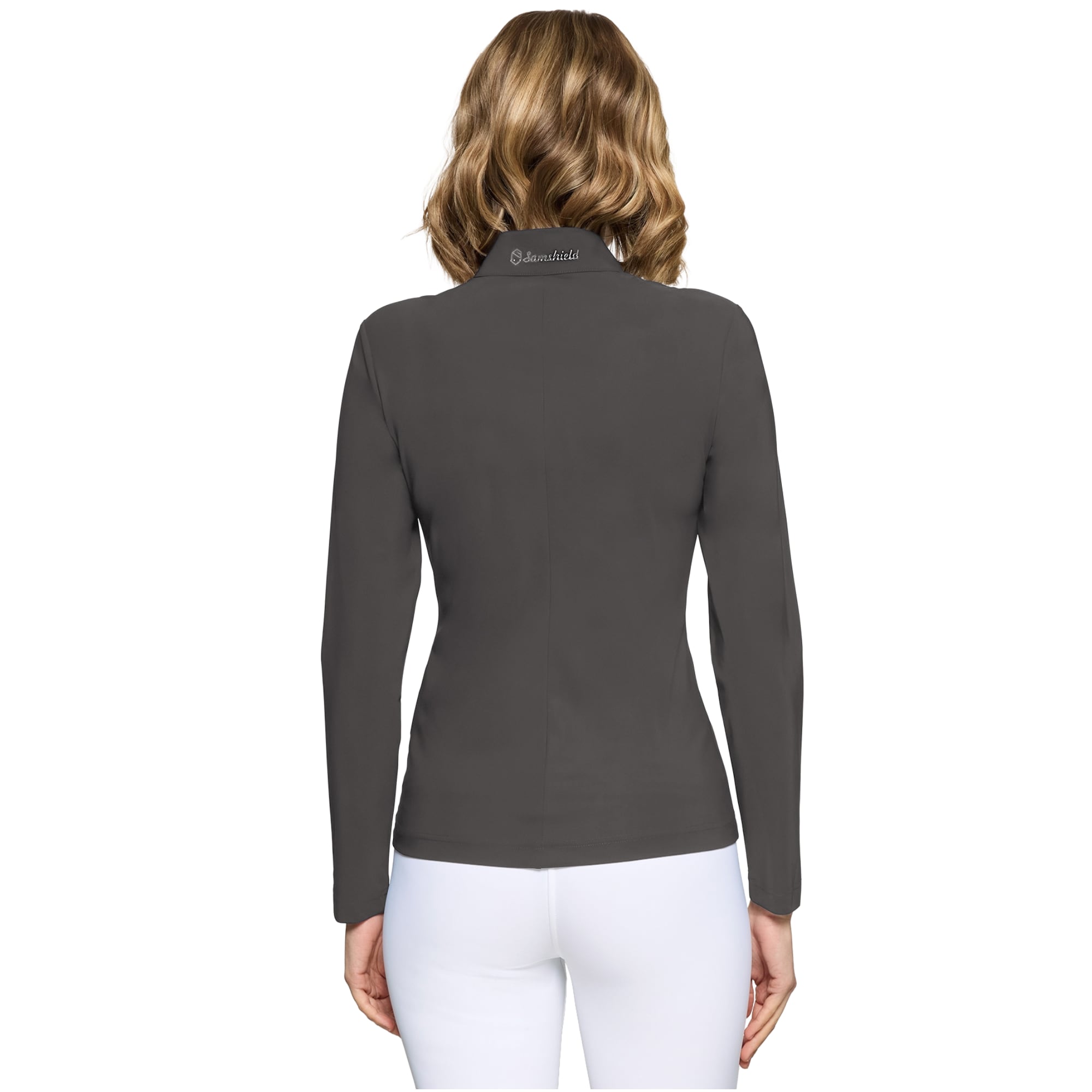 Dieses Reittop verfügt über einen durchgehenden Frontreißverschluss und zwei Reißverschlusstaschen. Das Design wird durch ein Samshield-Wappen mit Kristalldetails auf der Brust sowie ein Logo auf der Rückseite abgerundet.