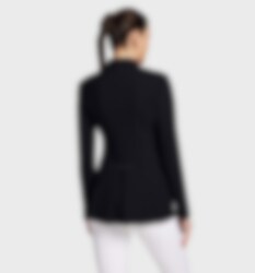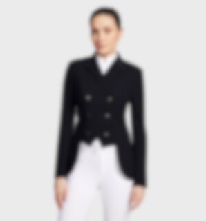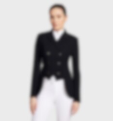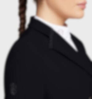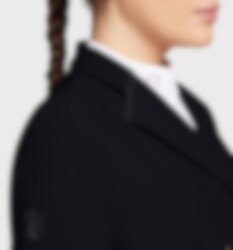 Short Frac Premium ist ein sehr eleganter Halbfrack mit schöner Passform und stilvollen Details. Diese Turnierjacke sticht durch ihre tollen Details aus der Masse hervor: Am vorderen Kragen ist „Swarovski Ultra Fine Rock“ angebracht, das sich auch auf dem Rücken wiederfindet; Auf dem rechten Ärmel befindet sich ein wunderschönes Samshield-Logo aus Swarovski-Kristallen. Die Frackspitzen sind mit Swarovski-Kristallen verziert.