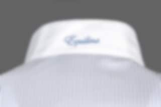 Das Hemd ist tailliert, kurzärmelig und blau-weiß gestreift mit einem größeren, weißen Teil an beiden Seiten. Der Kragen ist ebenfalls weiß mit blauem Equline-Text im Nacken. Der Text passt auch zu Equilines Logo, welches dezent auf die linke Brust gestickt ist. Das Shirt ist sehr bequem und perfekt für den Sommer.