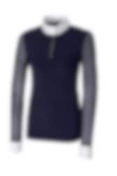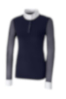 Mit diesem Wettkampfshirt von Pikeur sind Sie auf dem Wettkampfgelände wirklich die schickste Person. Das Elonie Turniershirt hat eine schöne marineblaue Farbe mit einem weißen Kragen mit Pikeur-Schriftzug in kleinen Kristallen und weißen Ärmelenden mit versteckten Druckknöpfen. Das Turniershirt hat Mesh-Ärmel für besten Komfort an heißen Sommertagen. Sie können den Kragen mit versteckten Knöpfen auf der Vorderseite, die mit Kristallen verziert sind, leicht öffnen.