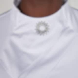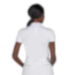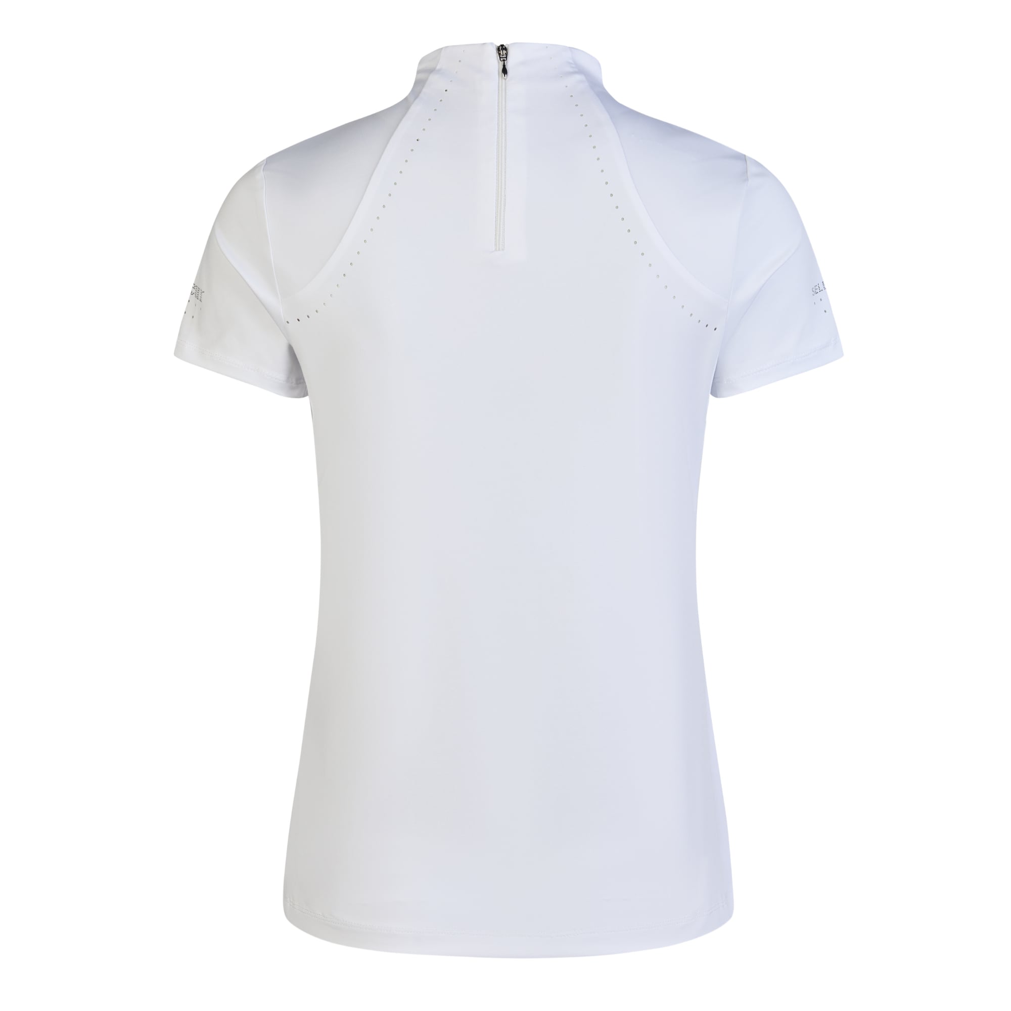 Der Kragen ist mit einer Strassapplikation versehen, ergänzt durch ein passendes Detail am Ärmel. Das Shirt wird hinten mit einem Reißverschluss geschlossen. Das Material hat eine glatte und atmungsaktive Oberfläche, und lasergeschnittene Partien an Ärmeln und Rücken sorgen für zusätzliche Belüftung. Das Turniershirt ist mit Livinguard-Technologie ausgestattet, die eine langanhaltende antibakterielle und geruchsneutralisierende Wirkung bietet.