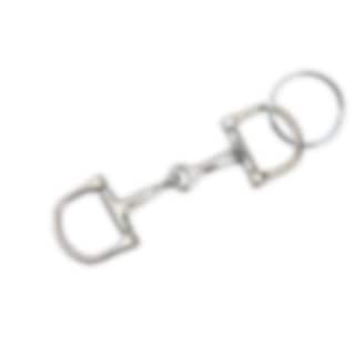 Ein eleganter Schlüsselanhänger in Form eines zweiteiligen D-Ring-Trensens, mit einem Schlüsselring, der am Trensending befestigt ist. Perfekt für Reiter, die eine praktische und stilvolle Accessoire für Schlüssel, Stalltasche oder Reitausrüstung suchen.