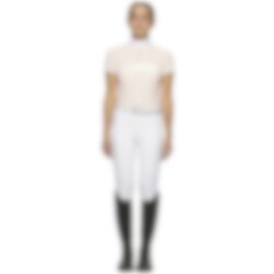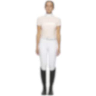 Dieses super schöne Turniershirt in hellrosa Farbe ist aus einem sehr dehnbaren Material und mit vielen schönen Details wie silbernen Knöpfen, Cavalleria Toscana Print in Weiß um das Shirt herum und einem CT Logo am weißen Kragen versehen.
