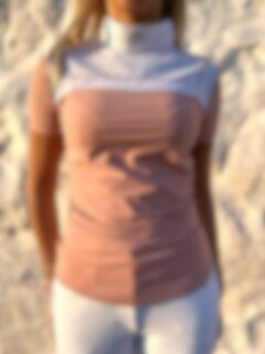 Dies ist ein super schönes und bequemes Turniershirt mit kurzen Ärmeln aus einem sehr dehnbarem Material. Das Turniershirt ist rosa mit weißen Abschnitten oben und am Kragen. An der oberen Hälfte unterhalb des Kragens hat das Reitshirt ein Mesh-Material, das an heißen Wettkampftagen für zusätzliche Belüftung sorgt. Das Turniershirt lässt sich bequem über den Kopf anziehen, da der Kragen mit zwei Knöpfen und einem seitlichen Reißverschluss geöffnet werden kann.