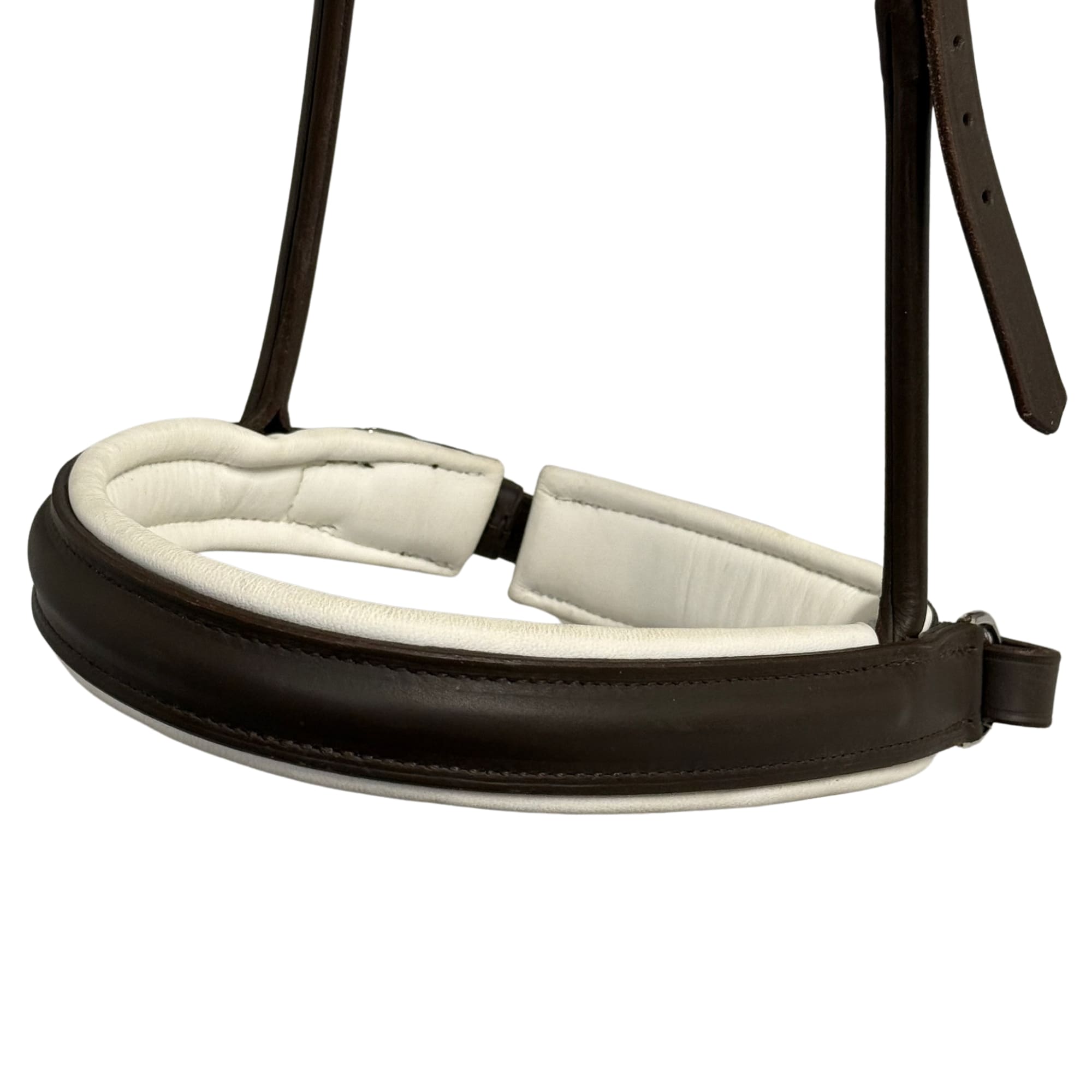 Weich unterlegtes, 4 cm breites Reithalfter, passend für Kandare oder zum Reiten ohne „Sperrriemen“. Die Lederarbeiten von Otto Schumacher sind weithin bekannt, und ihre Reithalfter bilden da keine Ausnahme. Dieses Reithalfter ist in der Farbe Negro (braun) mit weißer Polsterung gefertigt.