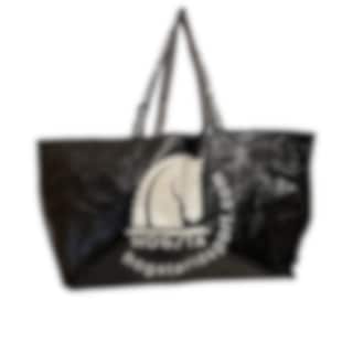 Schwarze Heutasche aus starkem, gewebtem Kunststoff. Auf beiden Seiten ist das eigene Logo von Hogsta Ridsport aufgedruckt.