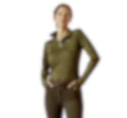 Dieses dehnbare und stylische Reitshirt aus Funktionsmaterial stammt von Ariat. Das Reitshirt hat eine schöne grüne Farbe mit einem Tarnmuster in hellerem Grün. Das Funktionsshirt Prophecy hat einen 1/4-Reißverschluss vorne und einen hohen Kragen. Auf der Brust befindet sich ein silbernes Ariat-Logo, das zum silbernen Reißverschluss passt.