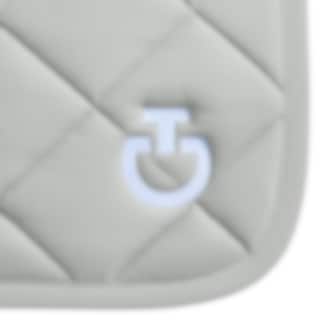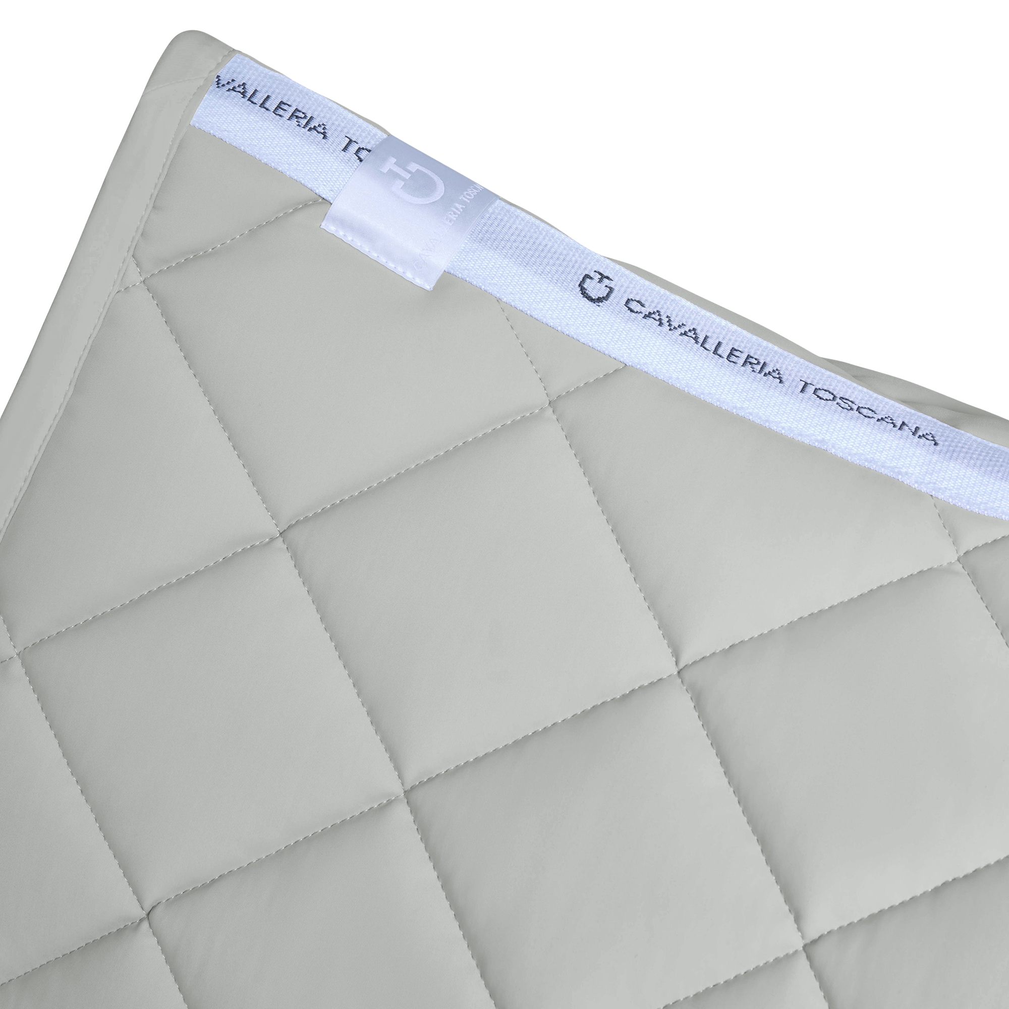 Die Diamond Quilted Jersey Dressurschabracke ist in einem eleganten hellgrün-grauen Farbton gehalten und verfügt über ein weißes CT-Logo sowie einen weißen Rückenkanal mit zusätzlichem Cavalleria Toscana Logo.