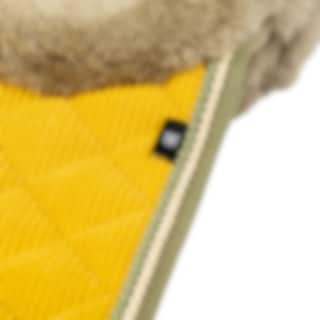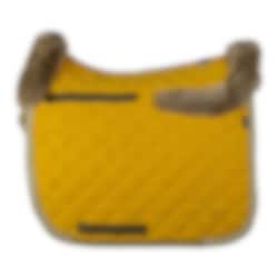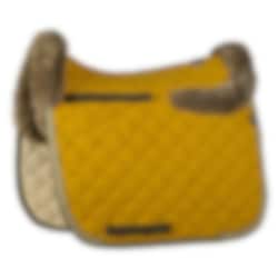 Die Lammfellschabracke ist in einem senfgelben Farbton „Curry“ mit Lammfell in der Farbe „Schlamm“ und zwei wunderschönen Zierkordeln entlang des Randes gefertigt.