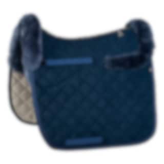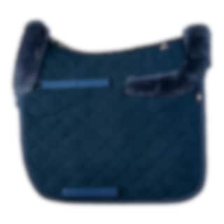 Die Lammfellschabracke ist in der Farbe Marine mit Lammfell in Blau und einer wunderschönen Zierkordel entlang des Randes gefertigt.