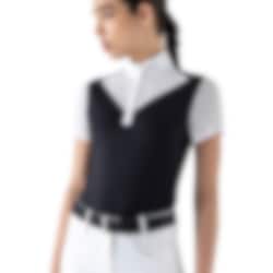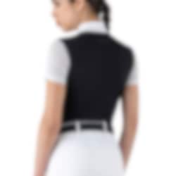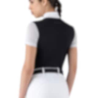 Das Design dieses Turniershirts ist sowohl elegant als auch angenehm kühlend. Der weiße, elastische Mesh-Einsatz an Brust und Ärmeln sorgt für ein frisches und luftiges Tragegefühl. Für einen Hauch von Luxus ist die Bluse mit dem Equiline-Logo im Nacken und dezenten Glitzerdetails in V-Form auf der Vorderseite verziert.