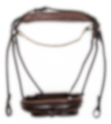 Ein anatomischer und rundgenähter Trensenzaum mit einem einzigartigen Genickstück, das Druck- und Muskelschäden in den Hals- und Nackenmuskeln des Pferdes vorbeugt. Das Zaumzeug ist mit einem dünnen Stirnriemen mit schicken Messingvierecken ausgestattet.